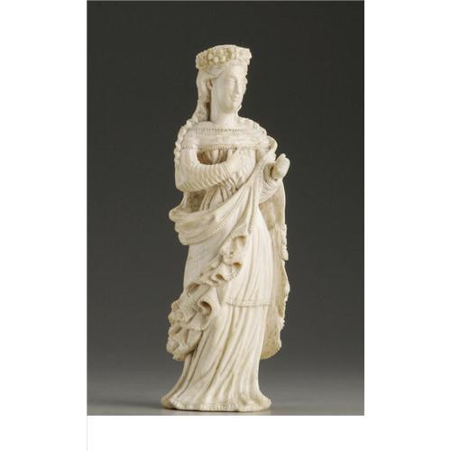<B>A European Carved Ivory Gothic-Style Figure</B></I><BR><BR>Unknown maker, Continental<BR>Eighteenth/Nineteenth Century<BR>Ivory<BR>Unmarked<BR>7 in. high<BR><BR>A courtly woman draped in an artfully arranged robe with a garland of flowers in her hair1 <BR><BR><B>Condition Report:</B> Wear commensurate with age and replaced hand
