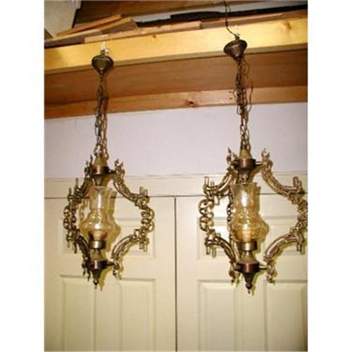 Pair of beautiful late 19th century chandeliers have etched globes with an irredescent glow to the slightly amber colored glass. Ornate three arm triangular metal frame surrounds the fluted chimneys with additional ornate metal tips and finials. American adapters have been used for use in the US and work perfectly. Single small based bulb. This unusual pair is in excellent condition and measures 19H X 13W X 13L with approx 20 inches of chain before the metal ceiling plate.