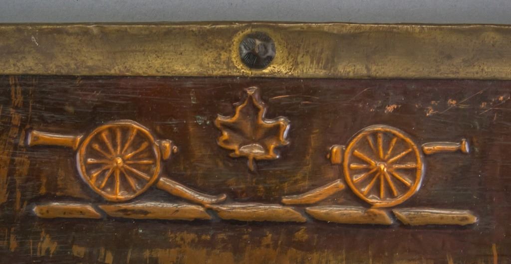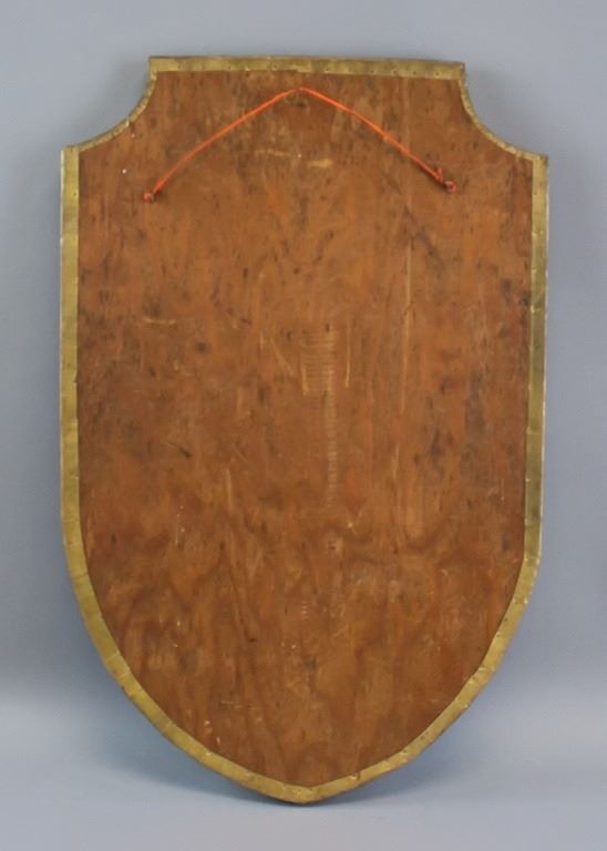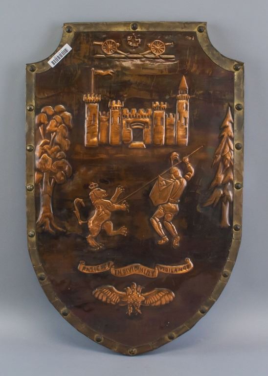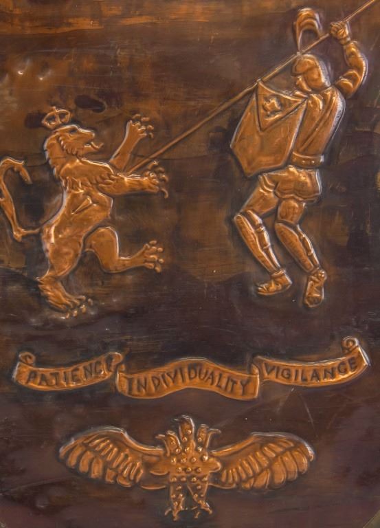 Copper plaque. Featuring a castle in the background with a knight fighting a crowned lion in the foreground. Handcarved. "PATIENCE / INDIVIDUALITY / VIGILANCE" on banner near the bottom. 56 x 35 cm, 2409 grams.