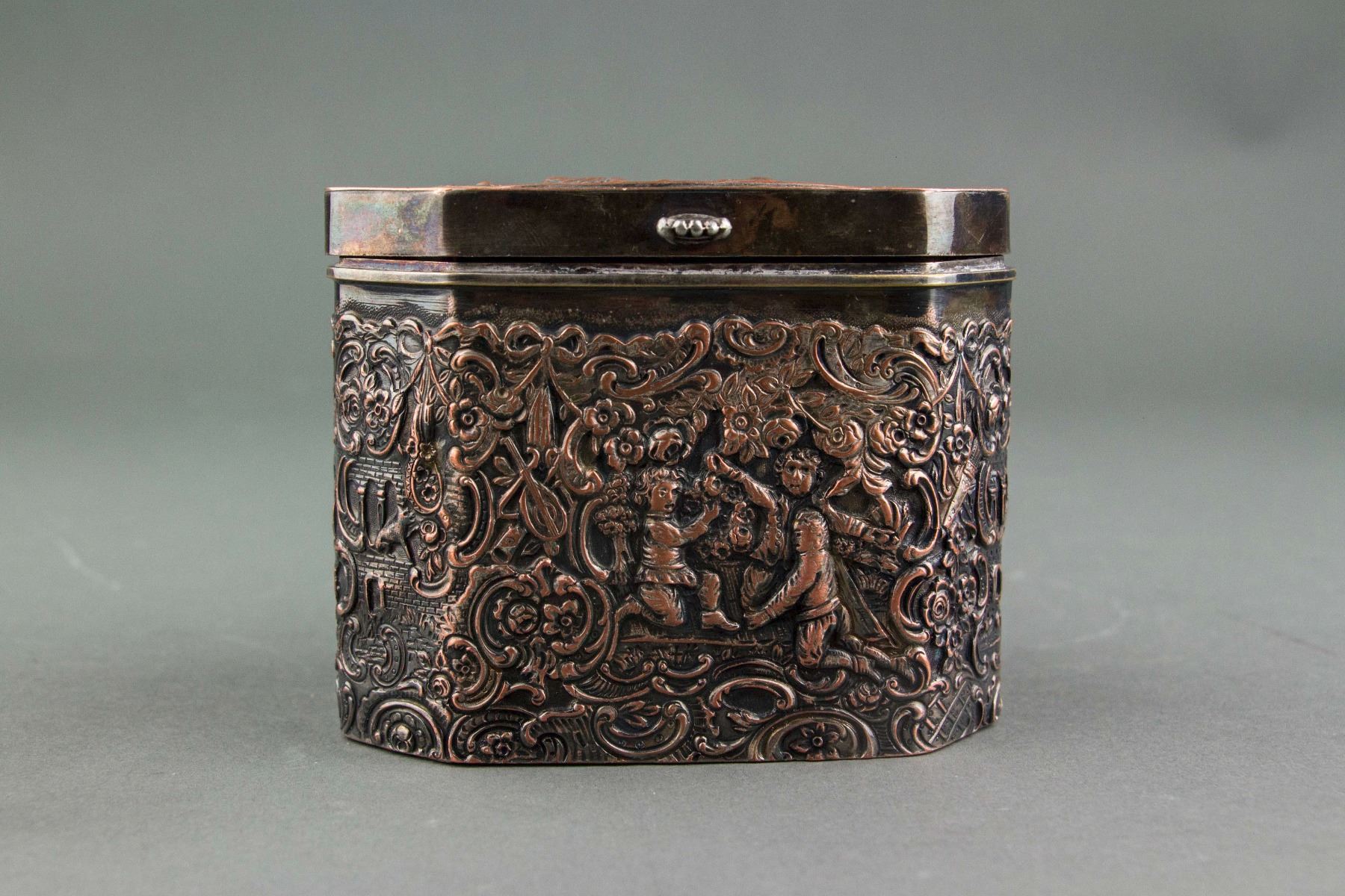 European copper tea box; of octagon form body with hinged cover; carved with figures and decorated with floral and leafy pattern; serial number mark on base; 9 cm x 11 cm, 312 grams