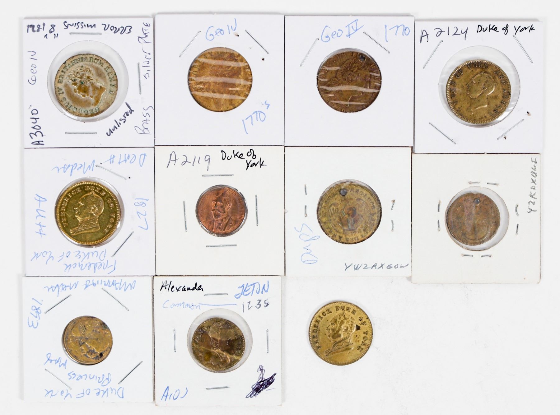 A variety of European brass gaming counters with representations of Czar Alexander (qty 4); George Frederick, the Duke of York (qty 5); and King George IV (qty 3).