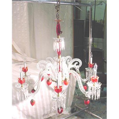 <table width="100%" border="0" cellspacing="0" cellpadding="4"><tr><td><em> </em></td></tr><tr> <td width="100%"> Unusual crystal Chandelier with beautiful red apple ornaments, six lights. One of a kind.