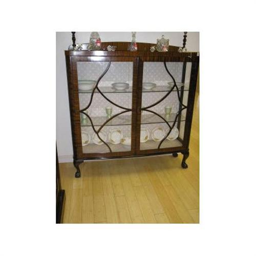 Showpiece! European Curio Cabinet with nice lattice design on doors and clawfoot legs. glass. Doors offer great visibility. Accessories not included.