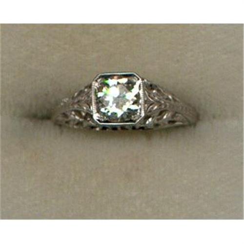 This unique ring is 14K white gold with detailed engraving and intricate open work. The square top has a milligrain border with a stunning .71 carat H-SI quality European cut diamond flush-set. The diamond came from an Estate and the ring is new of the finest quality. Size 6 1/2