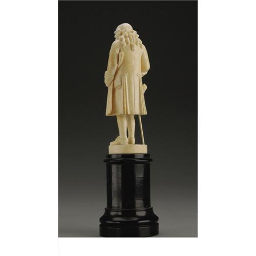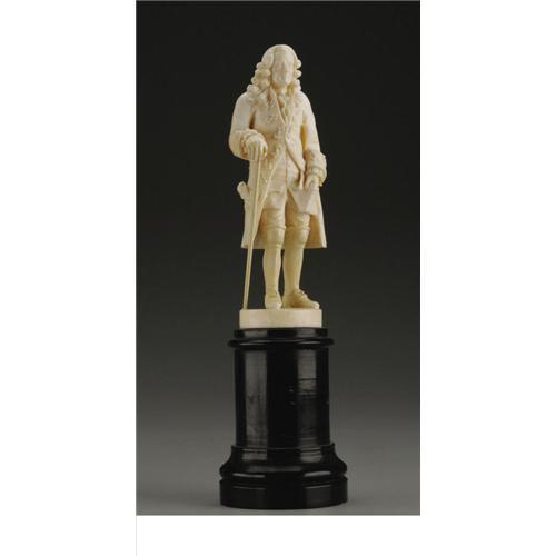 <B>A European Carved Ivory Figure</B></I><BR><BR>Unknown maker, possibly Dieppe, France<BR>Nineteenth Century<BR>Ivory and ebonized wood<BR>Unmarked<BR>4.75 in. high<BR><BR>An 18th-century man, possibly Diderot, with papers hanging out of one pocket and his hand in another, with a walking cane, on an (ebonized) wood plinth1 <BR><BR><B>Condition Report:</B> Wear commensurate with age and some restoration