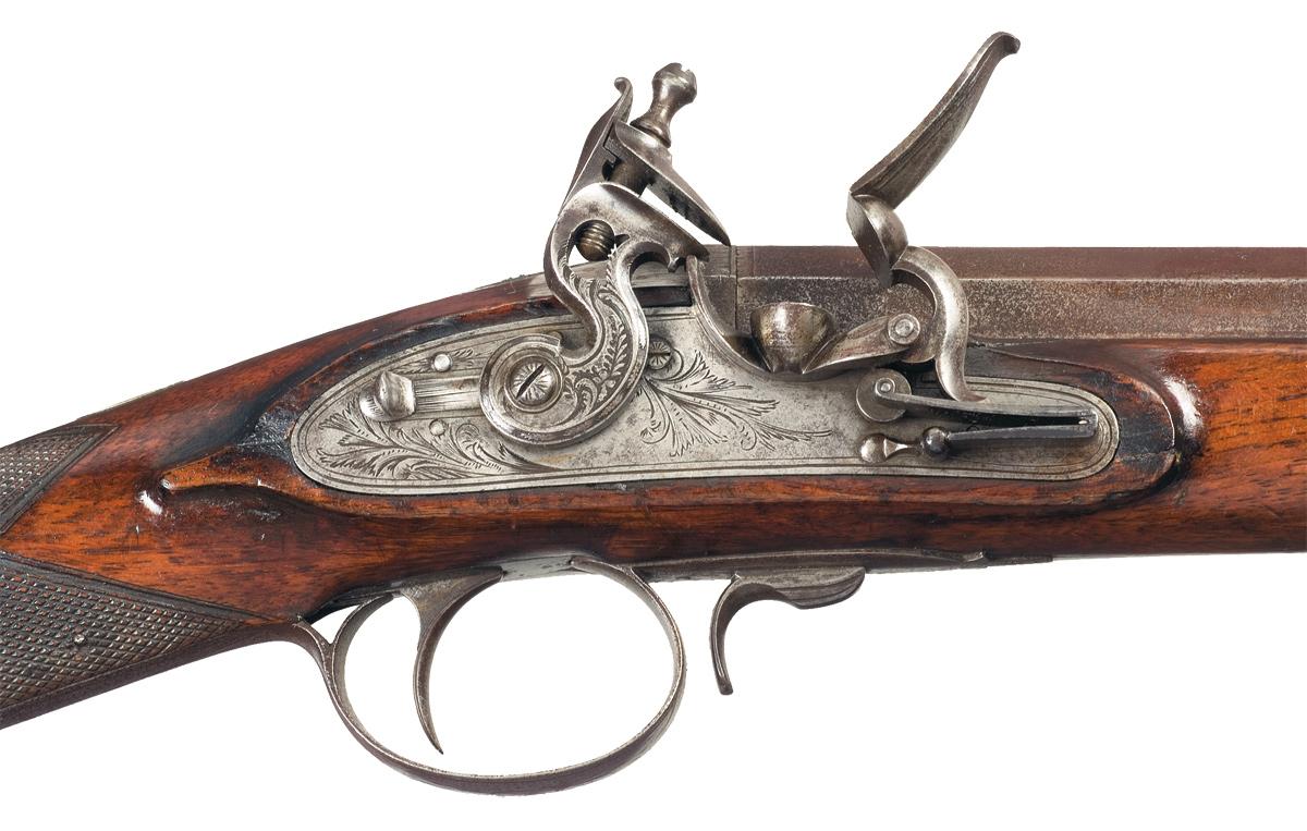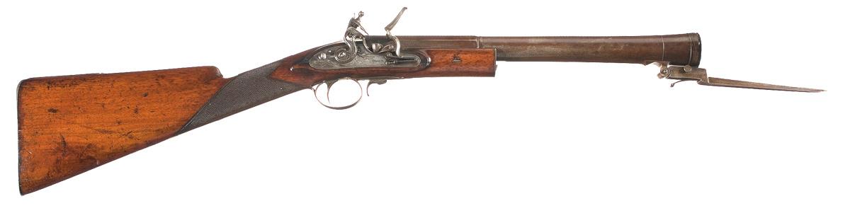 Produced without sights, with a cannon muzzle, engraved border at the breech and scroll designs on the tang. Mounted to the underside of the muzzle is a 5 3/8" triangular snap bayonet, with "crown/ IL" marked on the hinge, and the retention catch extending from the forearm tip, controlled by a lever mounted just ahead of the trigger guard. Hammer and lock plate are both engraved, with a roller frizzen spring, high rear fence and a half cock safety catch. Half length straight grip stock, with an engraved flat forearm tip plate, single wedge, engraved trigger guard, checkered wrist with silver inscription plate on top, and a flat buttplate with engraved extended heel. Overall length 30 inches.