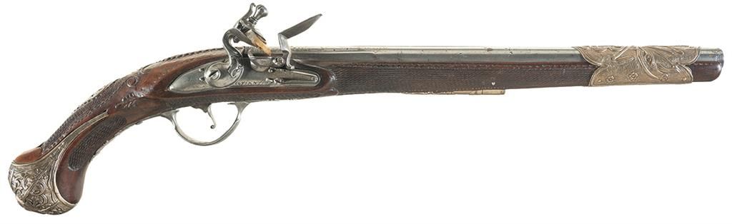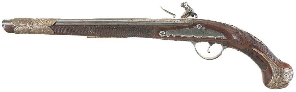 European Flintlock Pistol with Deep Relief Engraved Furniture
