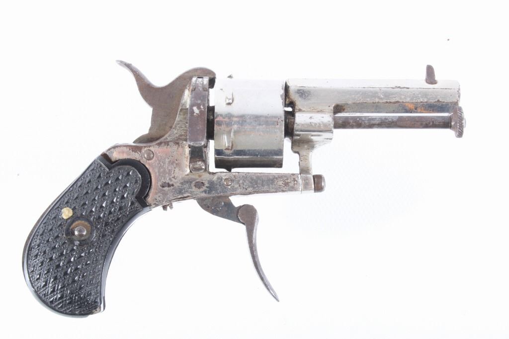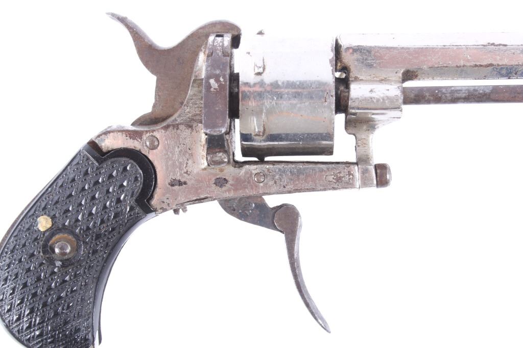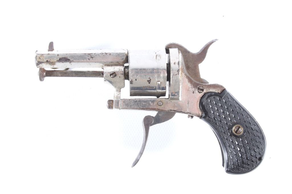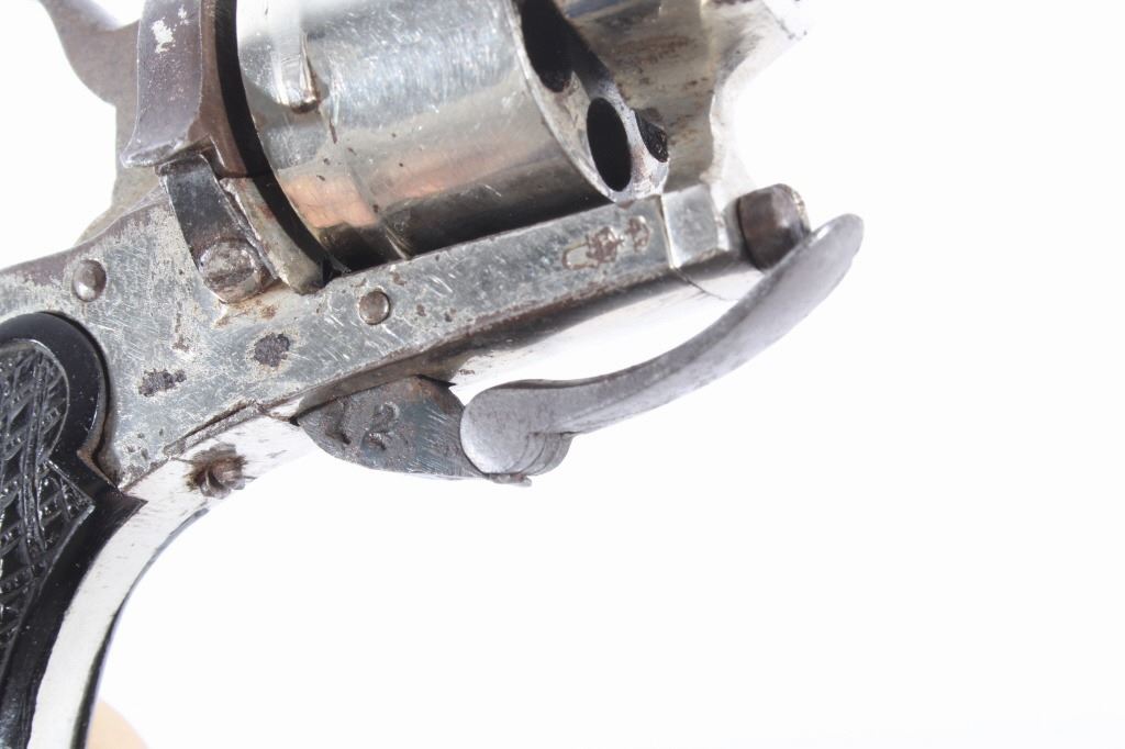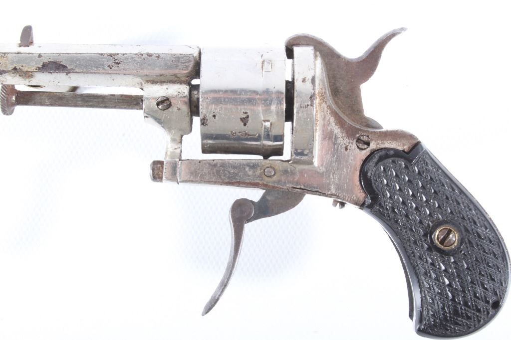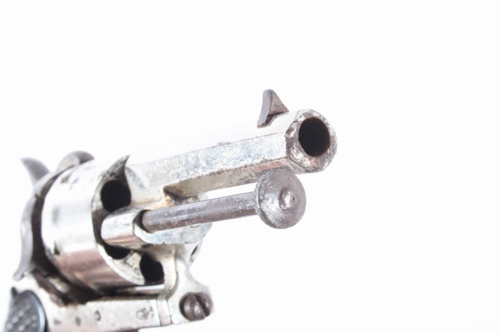 You are bidding on a European Folding Trigger .22 Caliber Nickel Revolver. The revolver features a 1 3/4" octagon barrel, six shot cylinder, hard rubber grips, folding trigger, and nickel finish. This revolver is in good condition for its age, showing some wear and signs of use. The mechanics work well, being tight and smooth. The bore is dark. This is a Curio & Relic firearm. FFL transfer or NICS background check required. The serial number is 7.
