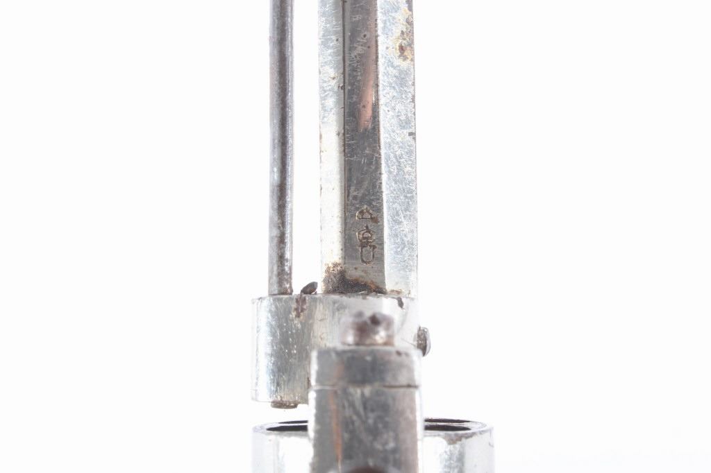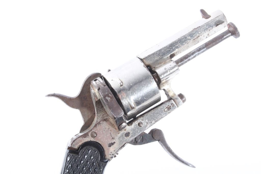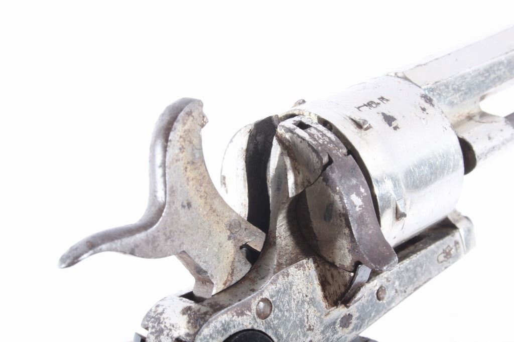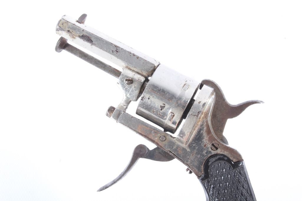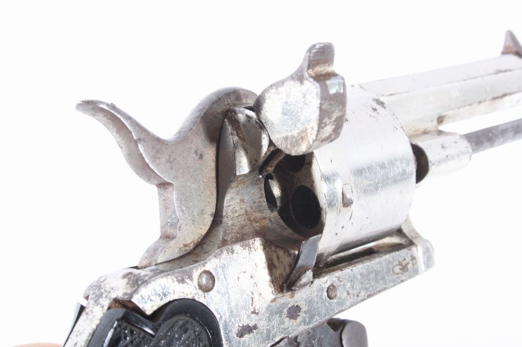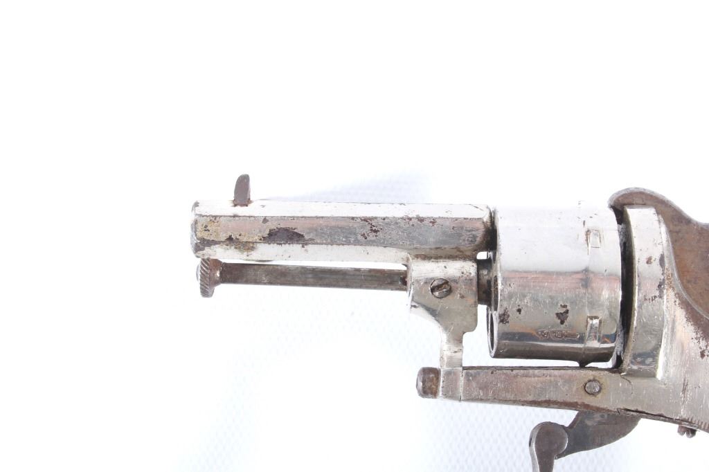 You are bidding on a European Folding Trigger .22 Caliber Nickel Revolver. The revolver features a 1 3/4" octagon barrel, six shot cylinder, hard rubber grips, folding trigger, and nickel finish. This revolver is in good condition for its age, showing some wear and signs of use. The mechanics work well, being tight and smooth. The bore is dark. This is a Curio & Relic firearm. FFL transfer or NICS background check required. The serial number is 7.