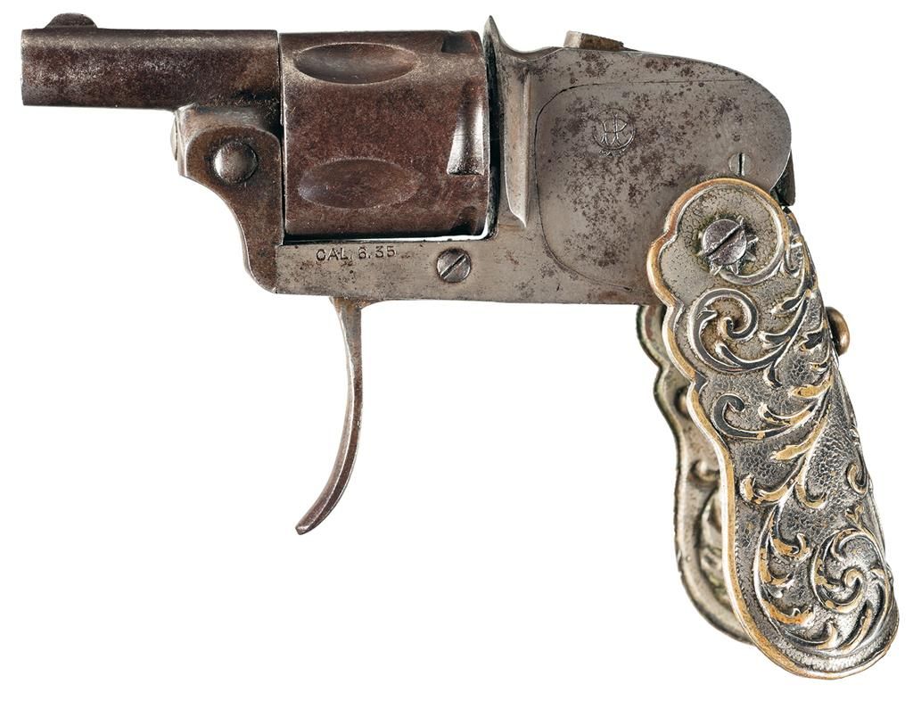 This revolver is very similar in appearance to the LeNovo folding grip revolvers. The left side of the frame is marked with an overlapping "P" and "I" in a circle with "TRADE" above and "MARK" below, and the left side under the cylinder is marked "CAL. 6.35". 5 round scooped cylinder, folding trigger and folding silver plated brass grip with a relief vine design.