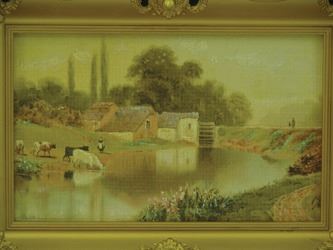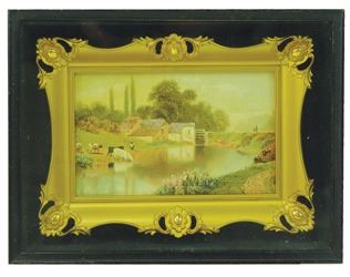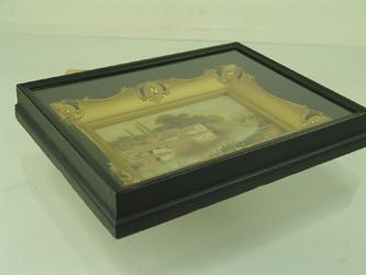 Vintage, original water color of a European countryside, first mounted in an exquisite gold gilded frame, and then enclosed within a glass shadow box. No visible signature. Very good condition. Early 1900s. 4" x 6-1/2", 8-1/2" x 11"