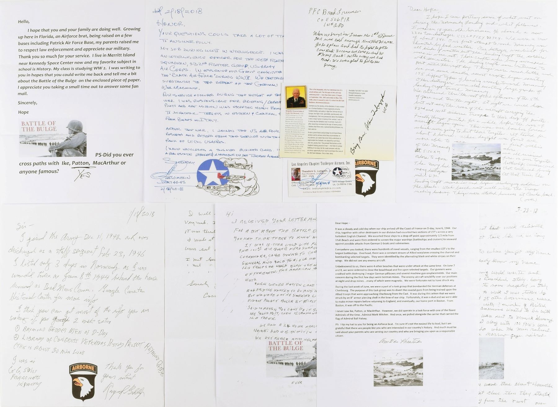 Remarkable collection of 10 items signed by veterans of the second world war’s European front, with survivors of D-Day and the Battle of the Bulge, consisting mostly of ALSs, including: Bradford Freeman; Raymond Geddes; Al Goldberg; Albin F. Irzyk (bio card); Theodore Lumpkin (letter and business card); Kenneth Muston; Aristides Phoutrides (TLS); Cosmo Uttero; and Daniel Zack. In overall fine to very fine condition. Accompanied by the original mailing envelopes, other related ephemera, and an unsigned handwritten letter from an unknown soldier.