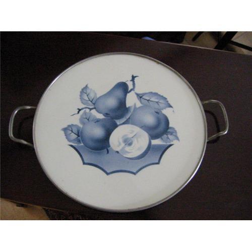 This Gorgeous 14 inch white tray has handpainted blue fruit accent trimmed with two handles in pewter metal. This tray is in excellent condition w vintage imperfections. On the base, symbol of grape stated Germany. It is numbered and is 11 inch in diameter. base is ball footed and .5 from the floor. This tray is magnificent!