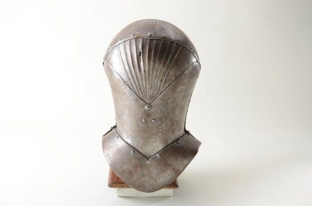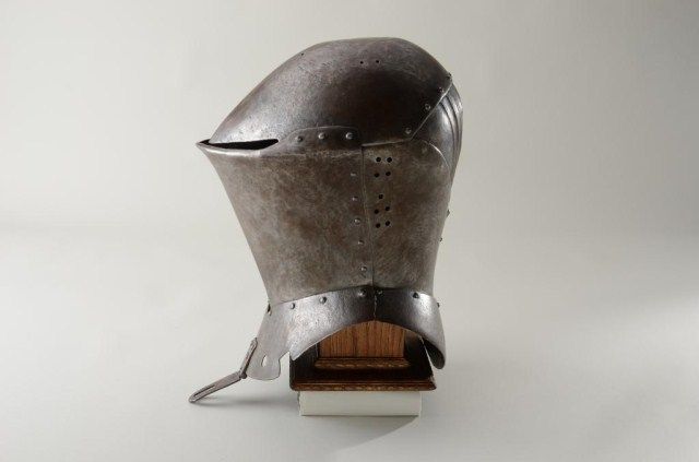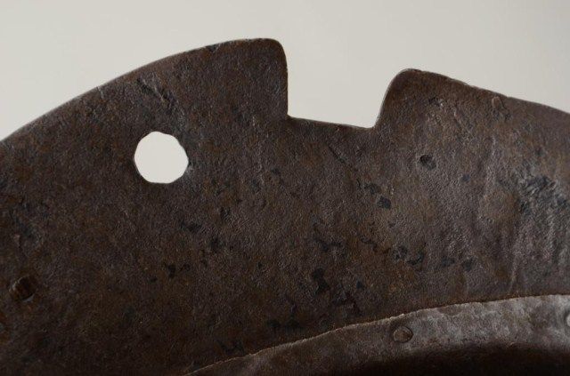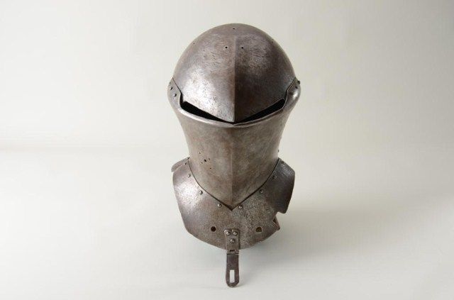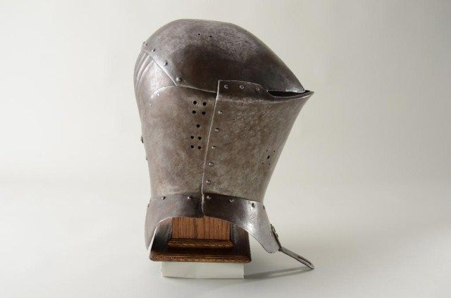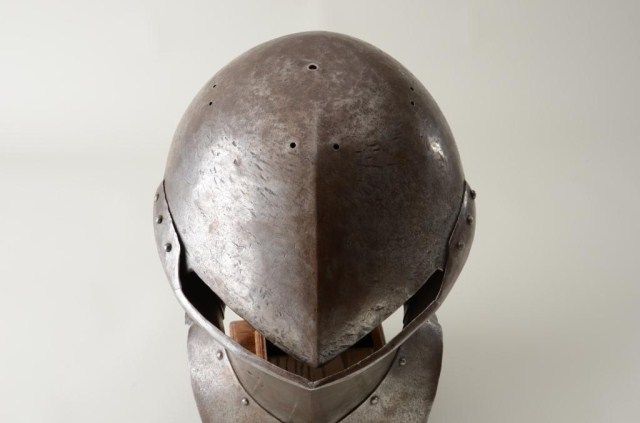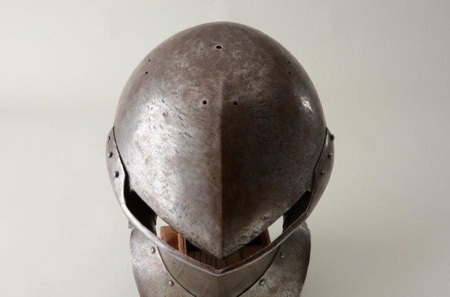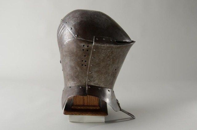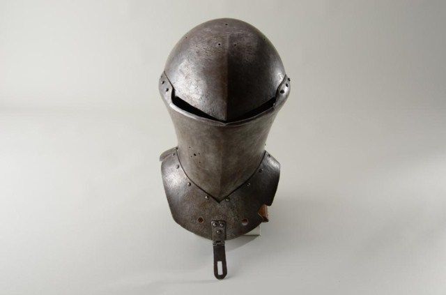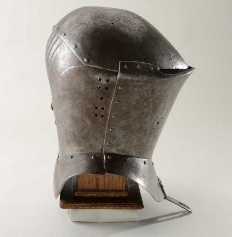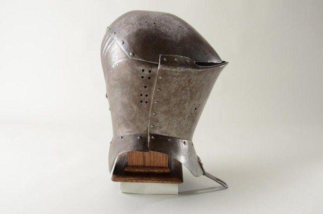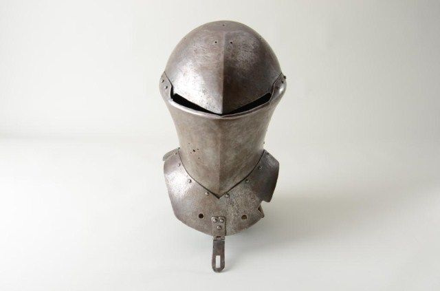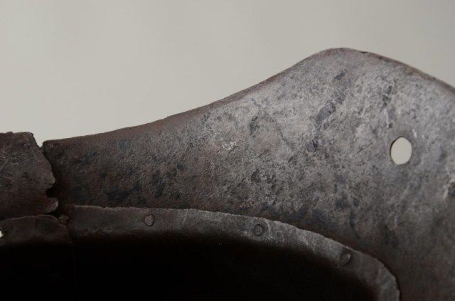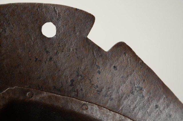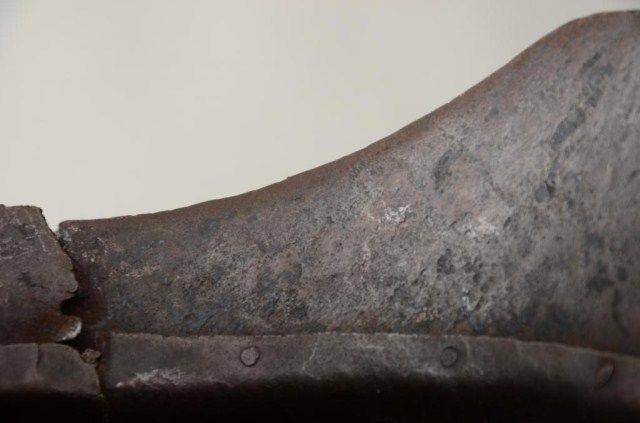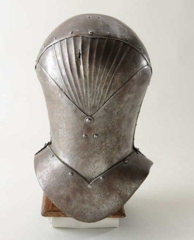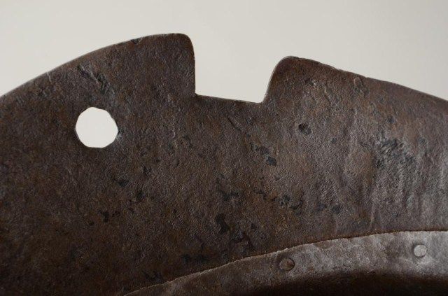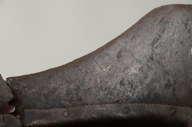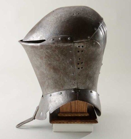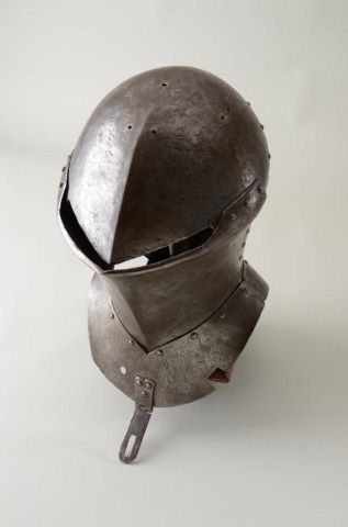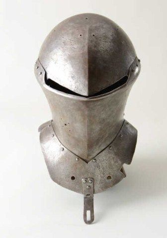 European Great Helm with frog’s mouth style front circa 1470 approximate. The helmet shows early forging with considerable slag and irregular lines that occur when forging at lower temperatures (1100’-1200’). Thecooling of the steel was essential to provide hardness and the structure of the steel itself can be seen like grain or “skin” pattern; particularly when photographed and enlarged. We have had this helmet examined by a top metallurgist and several armour experts who aided us in authenticating this helmet. The helmet is constructed in three (3) gauges of thickness, heavy in front to guard from blows, medium at center to bedefensive but lighten and lightest at rear where the least threat would occur in a joust. The helmet weighs 9-1/2 lbs. and is properly constructed so wearer is protected when head is raised to prevent splinters from lance coming through eye slot. The attachment latch area has been repaired and two (2) rivets restored. The condition is good for its age and there is some openings (small holes from rusting) in the back. In
