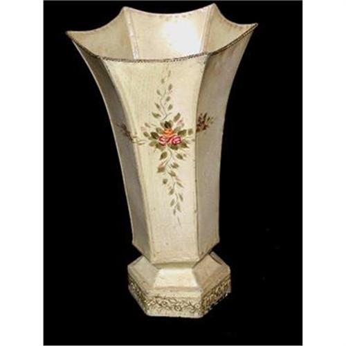 19th century European metal vase is hand painted in rose and green floral design on the front with decorative ornate embossed rose design on base. Background of antique cream. Tiny rope delicate design surrounds all top edges. The vase is weighted to prevent tipping. Excellent condition.