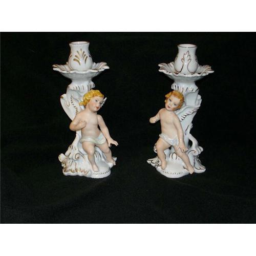 A Wonderfully Appointed Set of European Hand Painted Porcelain Cherub Candleholders, "Moga".