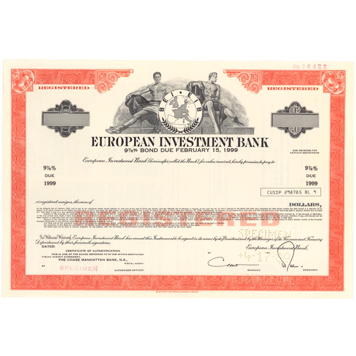 [SPECIMEN] ----, New York. 6 7/8% bond specimen in European Investment Bank. Orange / Black. Vignette of two allegorical males on either side of company logo at top center. Perforation cancellation at signatures. Upper left edge folded. Overall Fine.