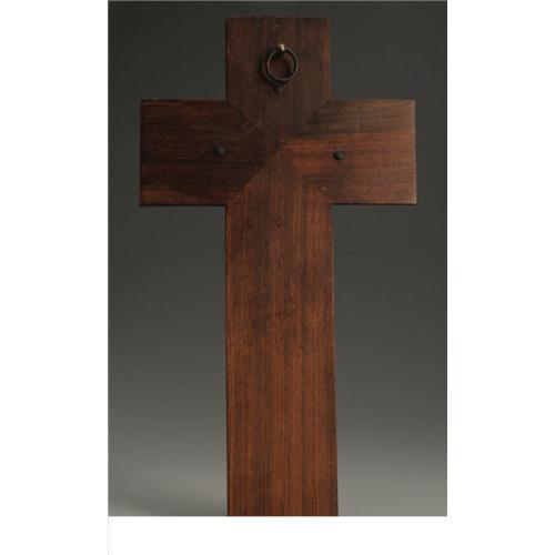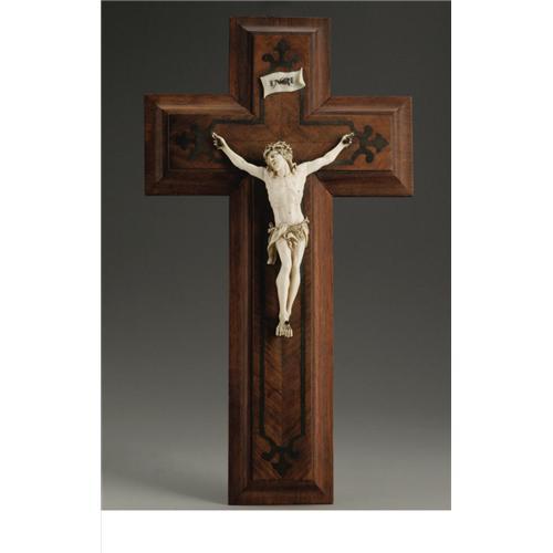 <B>A European Ivory Carved Figure of Christ</B></I><BR><BR>Unknown maker, Continental<BR>Twentieth Century<BR>Ivory and wood<BR>Unmarked<BR>15.5 in. x 8.62 in. (overall)<BR><BR>Of the crucified Christ below a banner engraved <I>INRI,</B></I> all on an inlaid Latin wood cross1 <BR><BR><B>Condition Report:</B> Wear commensurate with age and possible loss at the bottom of the cross