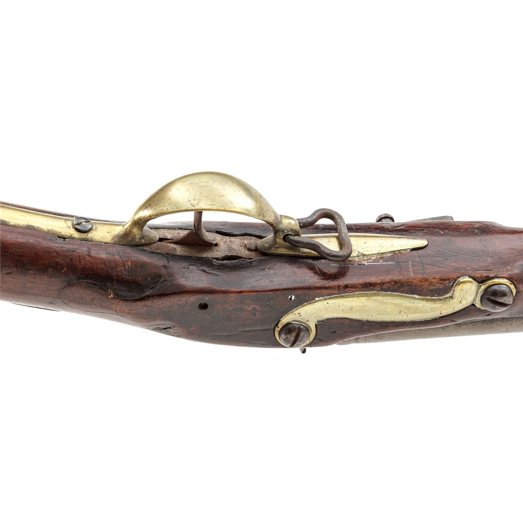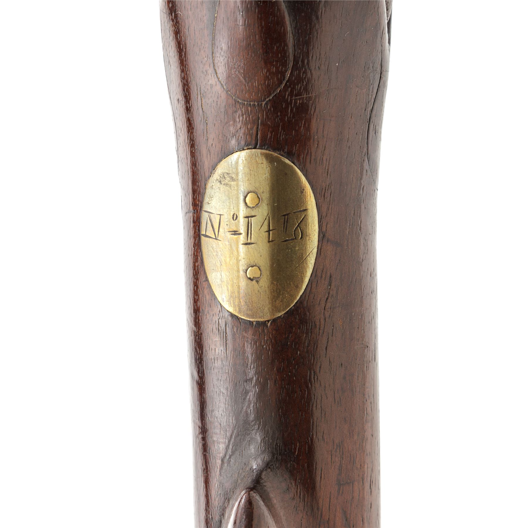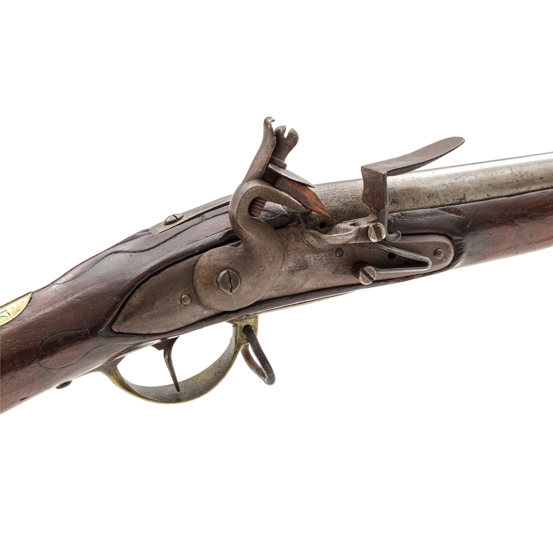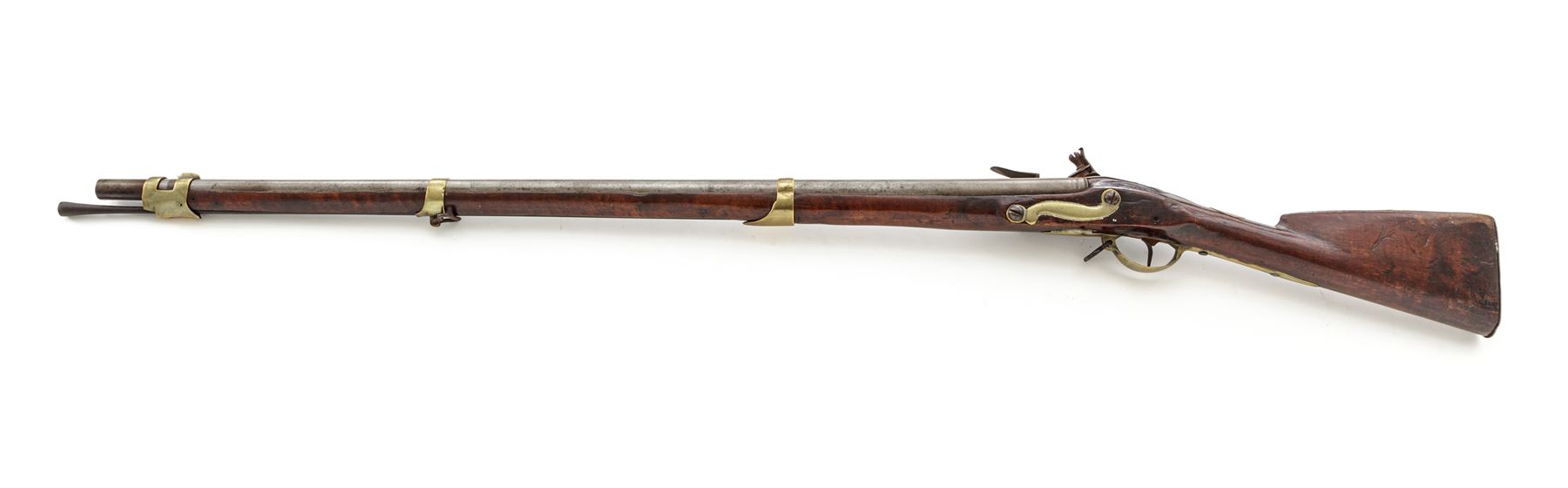 Napoleonic Wars Era European (Likely Dutch) Fullstock Flintlock Musket, NVSN, .75 cal., 39.5'' barrel with brass blade front sight (integral with double-strap top barrel band) and simple grooved rear sight; large iron lockplate with teat at rear; brass furniture including triggerguard with sling swivel mounted at front of loop and a long rear tang, serpentine sideplate, heavy buttplate with long top tang; oval plaque at wrist marked ''No 1418'', and three spring-retained barrel bands (middle with sling swivel); tulip-head iron ramrod; hardwood fullstock having nicely carved aprons at either side of lock and at top barrel tang. Condition is good+, the steel parts with a cleaned gunmetal gray color, heavy black powder pitting at barrel breech, original markings illegible, the brass with cleaned patina. Stock is solid with the expected scuffs and marks of age and military use, losses at top edges along barrel (particularly on right side), and a later coat of varnish. Frizzen spring and screw are modern replacements. Musket appears to be in original flintlock configuration, with unbushed touchhole. Action is extremely stout; smoothbore is fairly clean showing moderate rust. Est.: $800-$1,200. (Antique)
