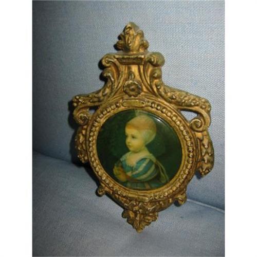 This gorgeous Medalion is 8 inch tall. A Design statement for wall or stand and is of composition fragile plaster. European image of a child covered with clear plastic. This lovely medalion is in vintage condition and is 5 inch wide with .5 inch thick. Stand is not included.