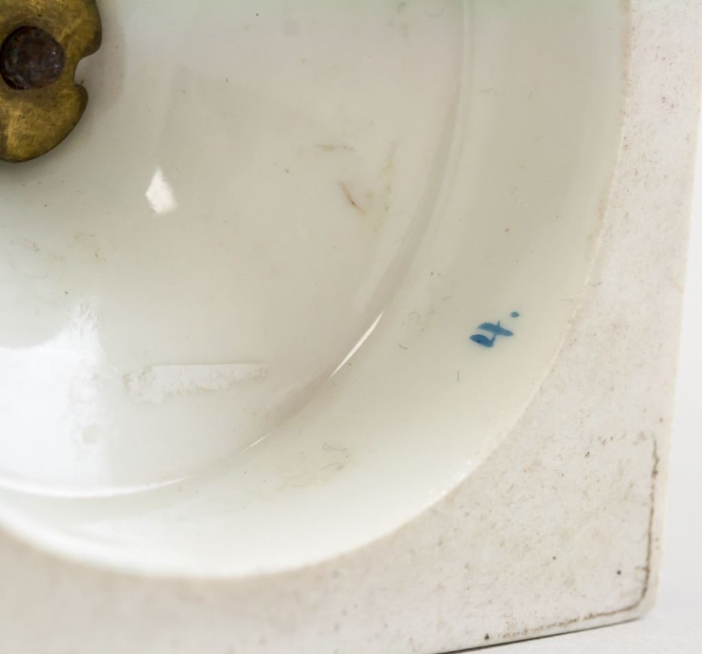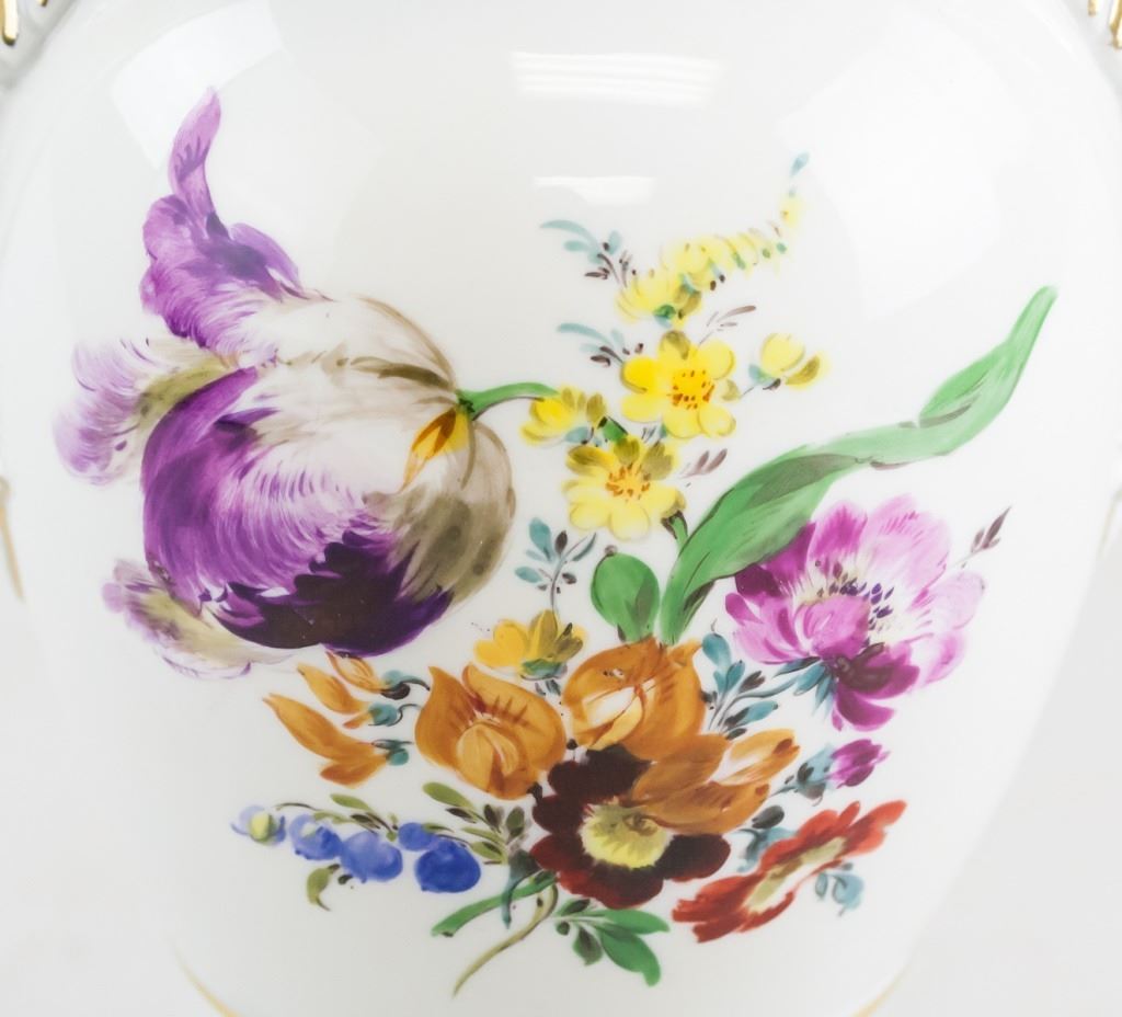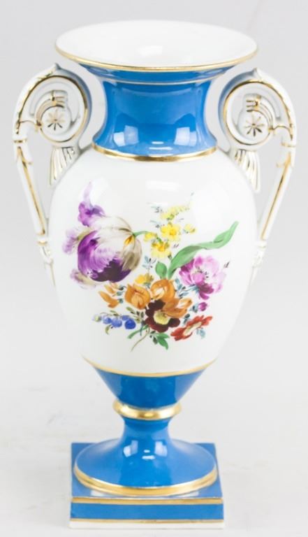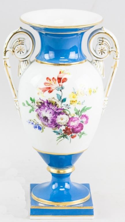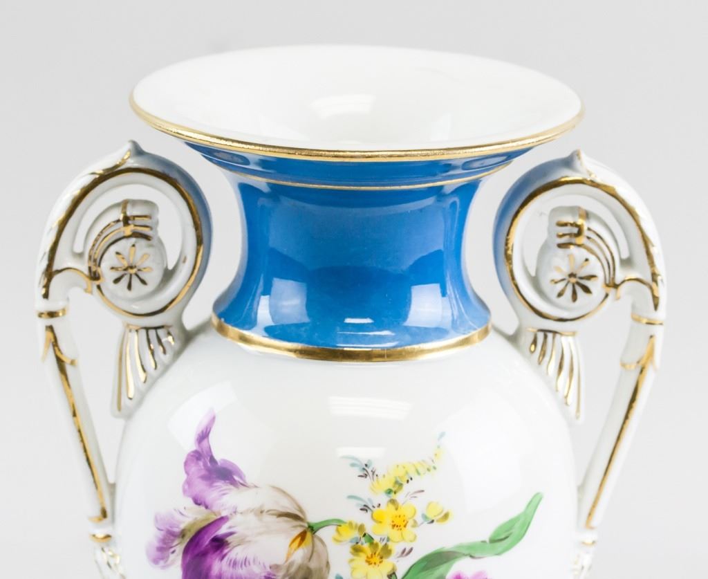 European Meissen porcelain vase. With wide opening and large curved handles. With oval body and flared base resting on square pedestal. Of blue and white tone with colorful flowers. Blue mark on base. 22 x 14 cm, 698g