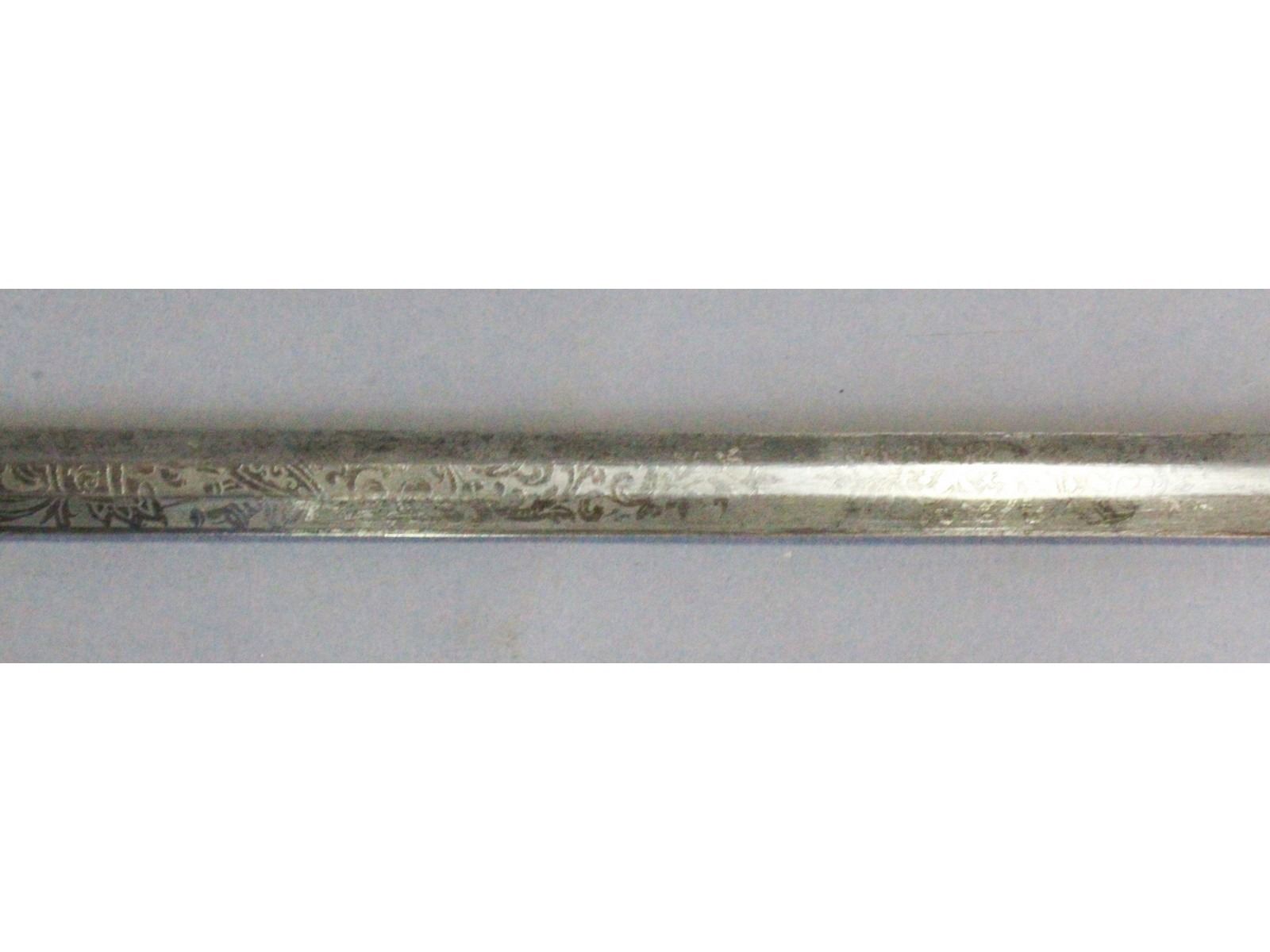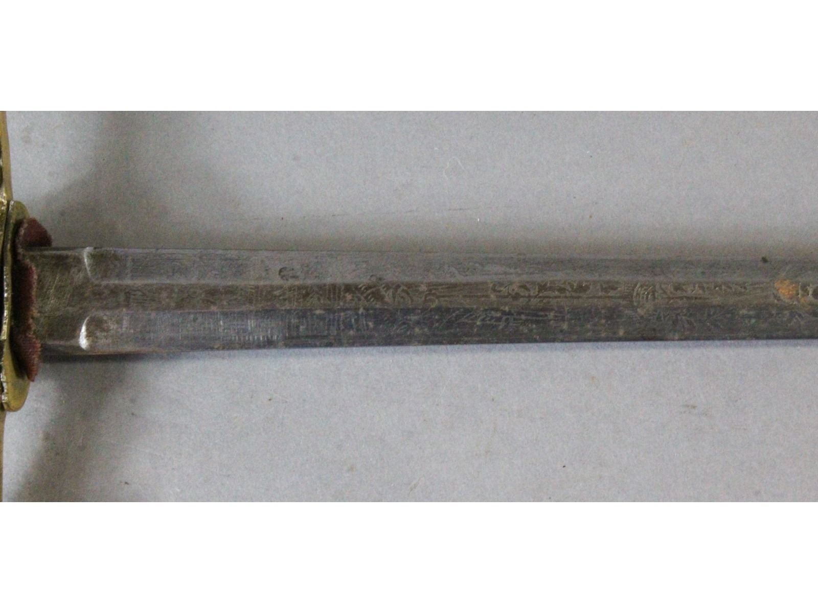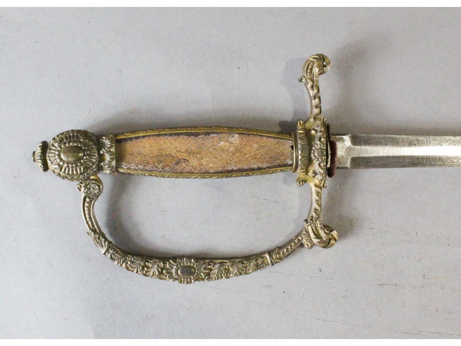 Possibly German or French. Ornate brass mounted hilt. Missing the grip scales. Possible were mother of pearl. Straight, slender blade engraved. Very nice condition.