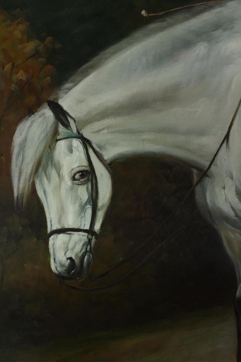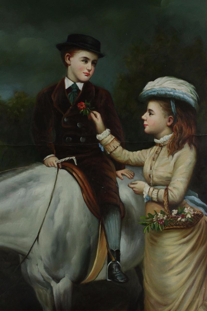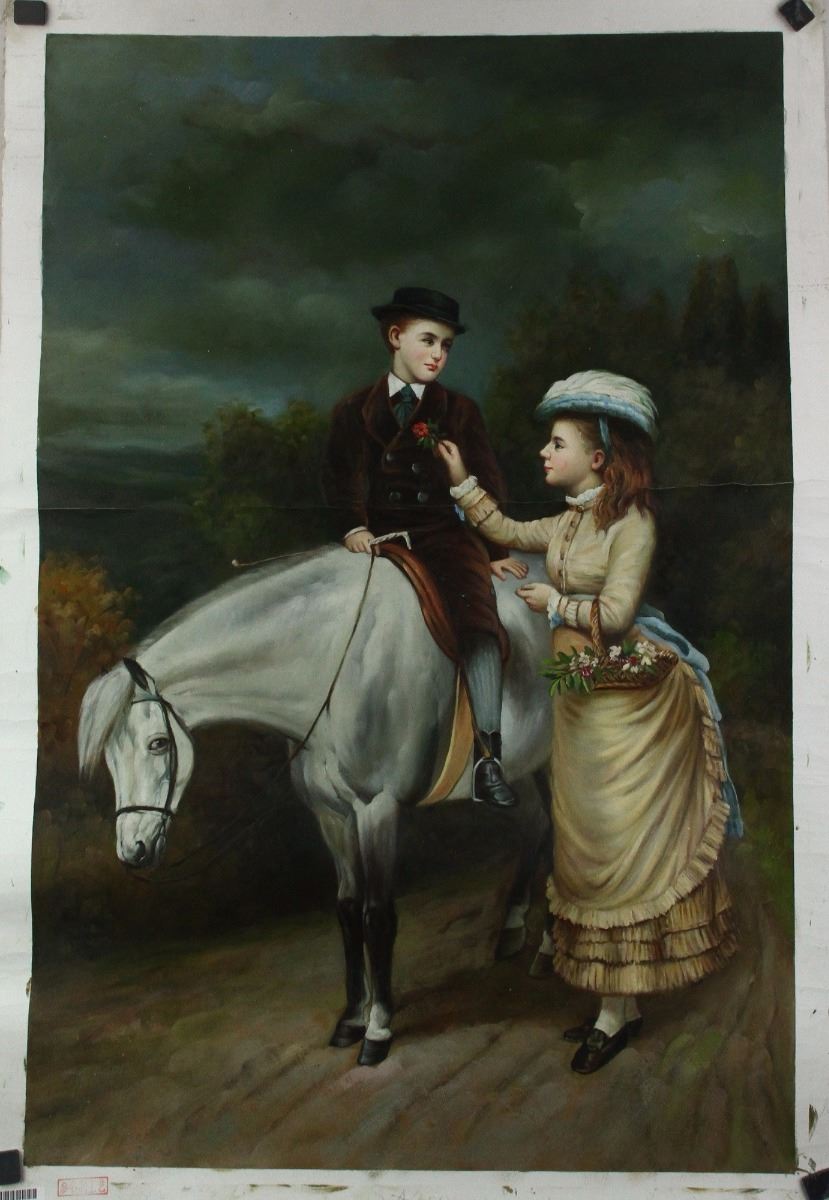 Boy rides on horse with a girl; European oil painting on canvas; 99 cm X 69 cm