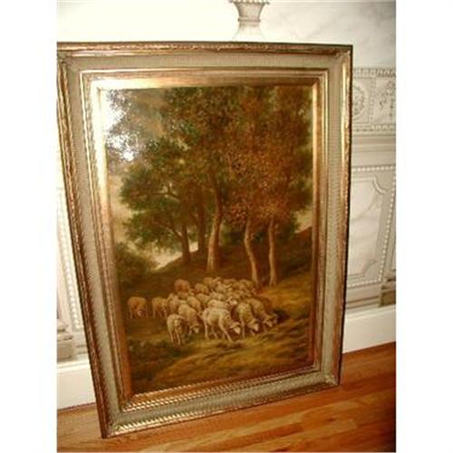 </font></strong>European oil painting of a flock of sheep on a tree lined hillside grazing at dusk which gives a very peaceful feel. Beautiful colors in the trees of rose,green and brown as well as the landscape and sky at dusk. Signed in lower left corner by H. Assteyn,a 20th century European artist of the very early 60's. Extremely detailed brushstrokes. Framed in a wide antique gold carved frame with gray toned ribbing which matches the dusk sky. Ornate antique gold inner frame and solid gold wide liner. Excellent condition. Measures 44H X 32.25L X 2.5D. </font>