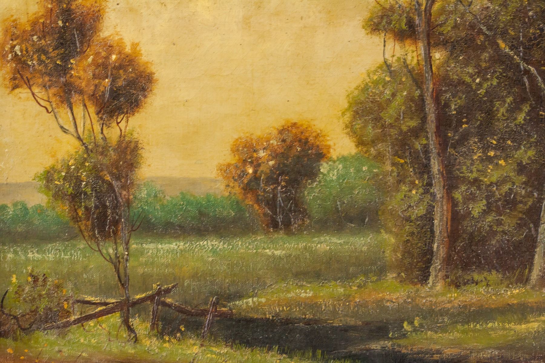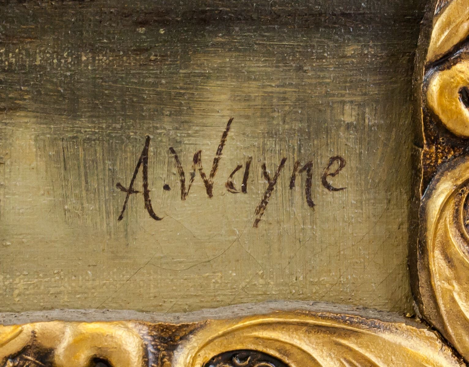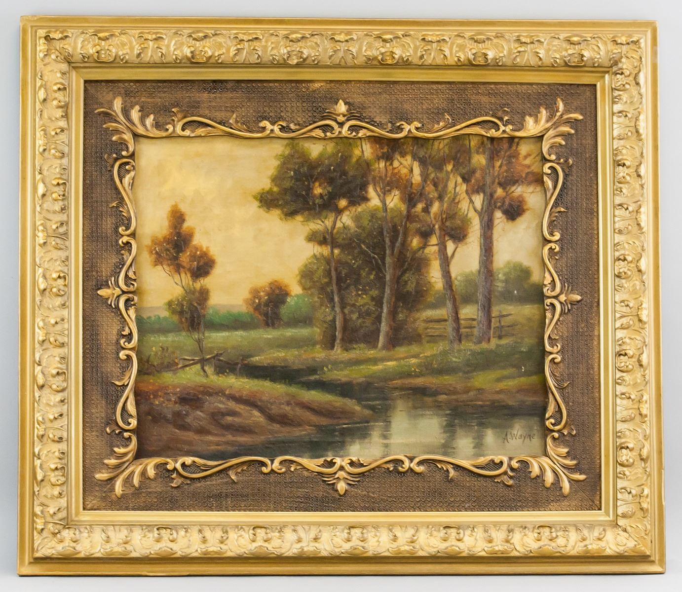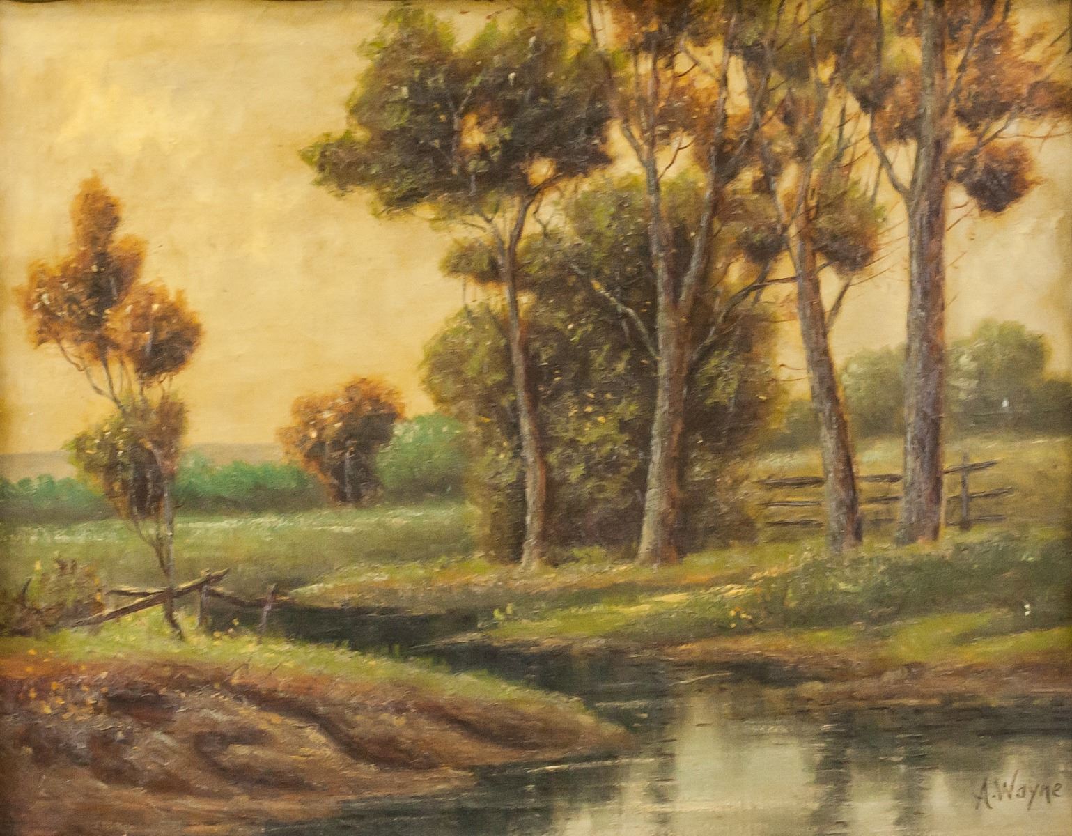 Oil on canvas, framed. Featuring landscape scene with a river running from the foreground to the background, banked by slender trees. Signed "A. Wayne" on the bottom right corner. 38 x 47 cm (15 x 19 in), Frame: 66 x 76 cm (26 x 30 in)