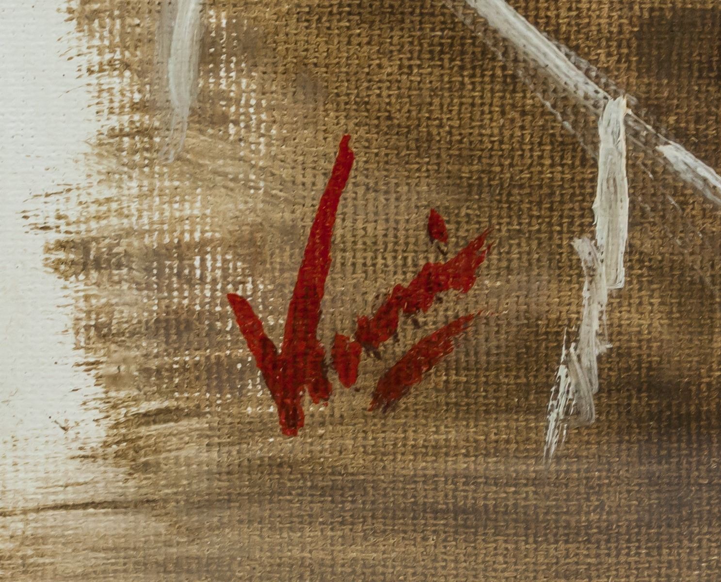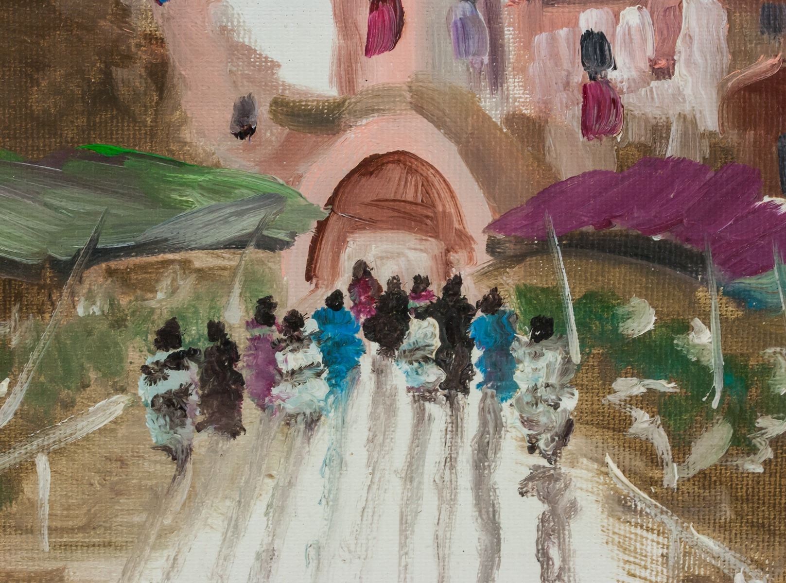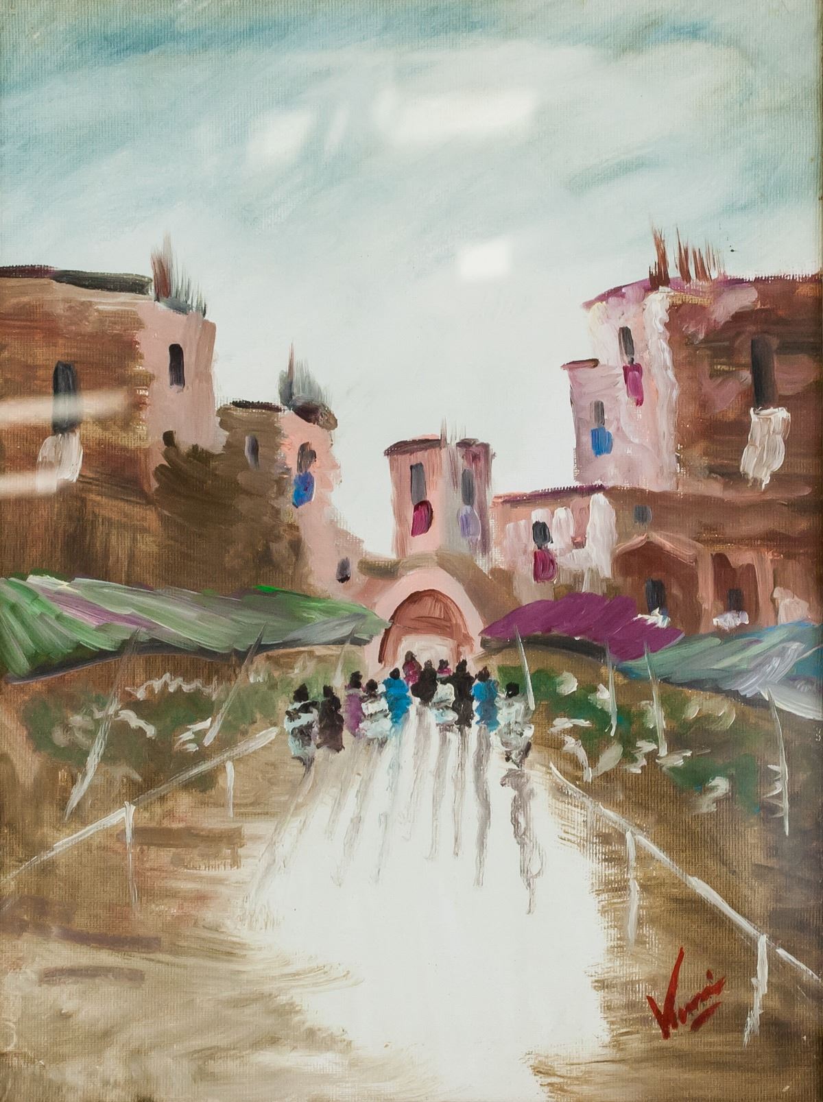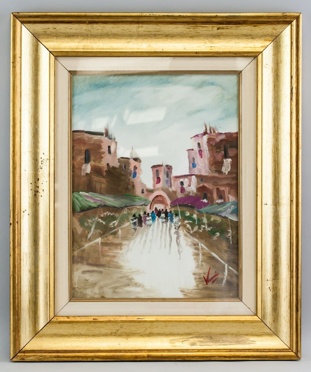 Oil on canvas, framed. Featuring city scene with a group people walking into the the city through an archway. SIgned "Vinnis" on the bottom right corner. Hanging hook on verso stamped with "Homecraft". 41 x 32 cm (15 x 11 in) Frame: 61 x 50 cm (24 x 20 in)