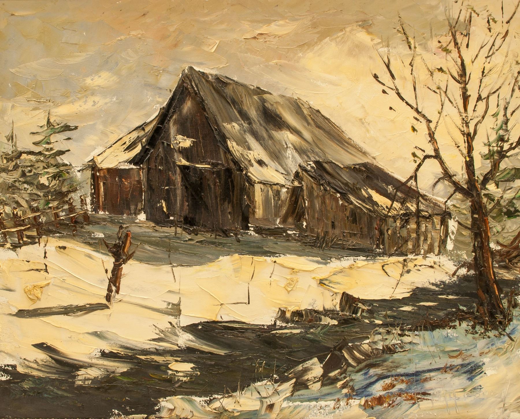 Oil on canvas, framed. Titled "Ye Old Barn" Mil Pouli lower center of frame. 23 x 30 inch (58 x 76 cm).