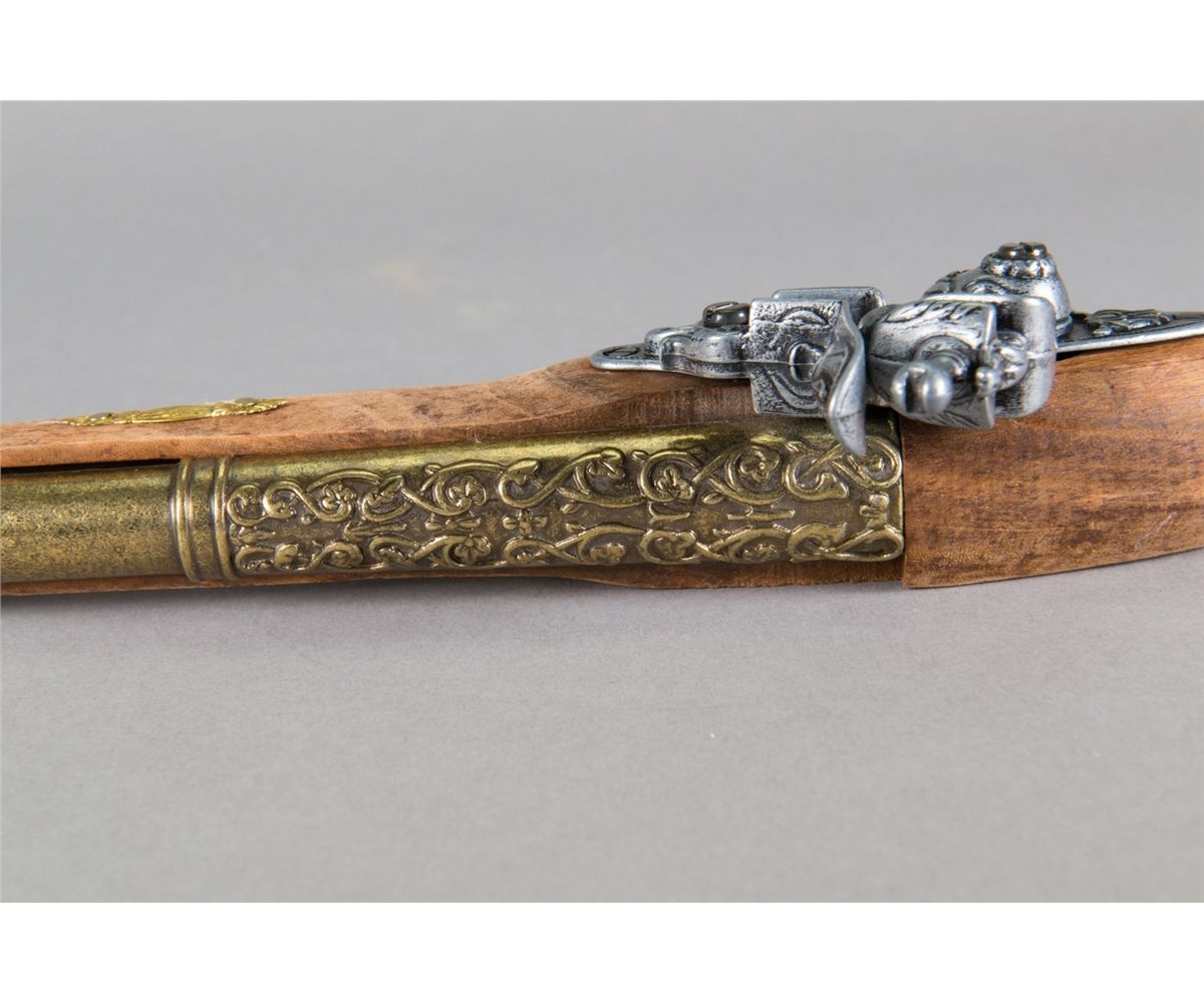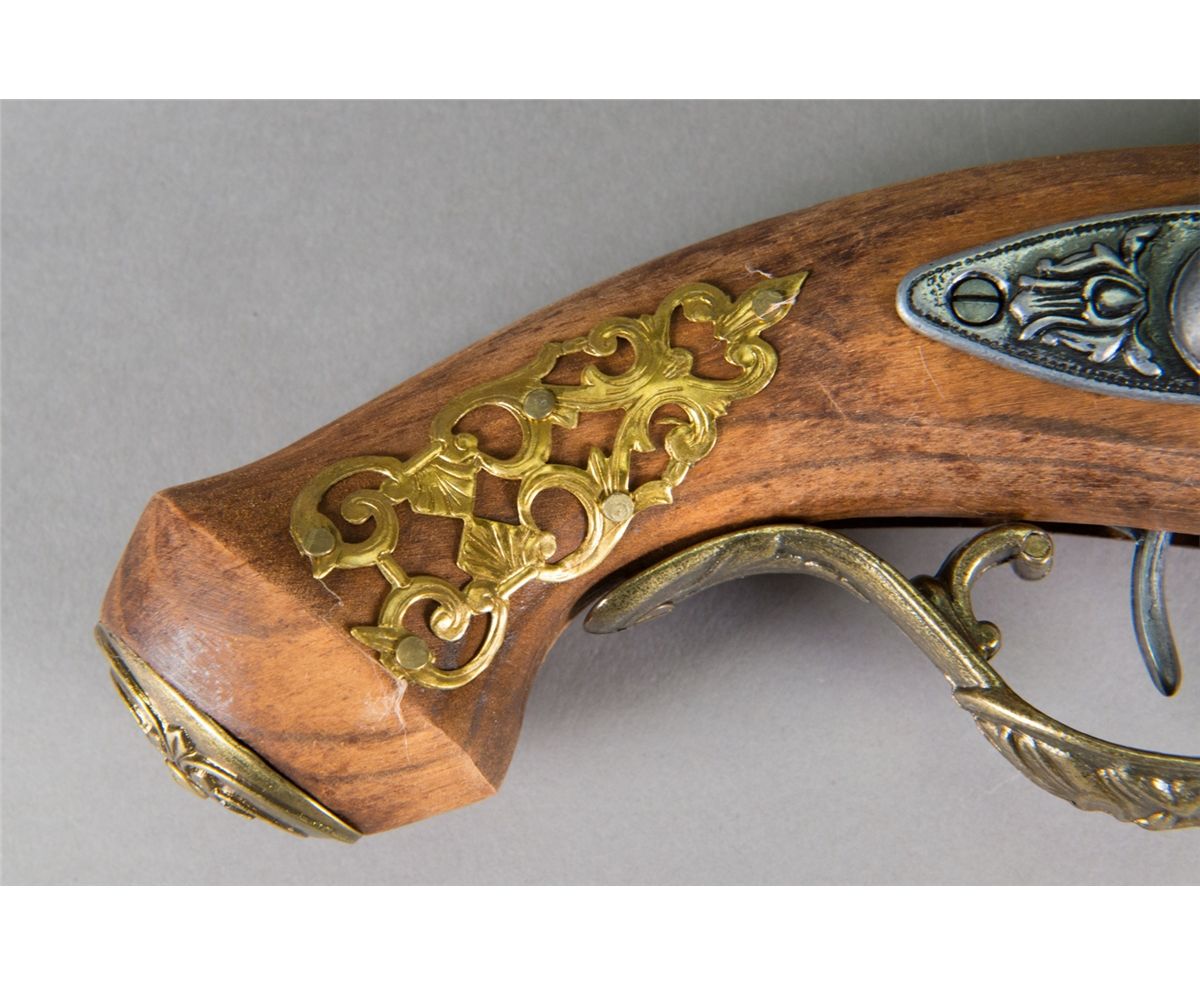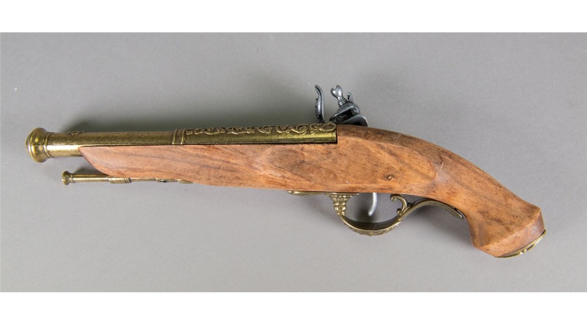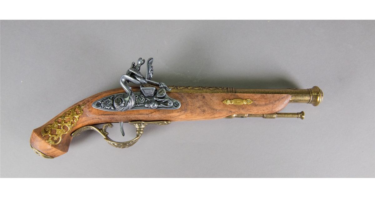 European old flintlock pistol; featuring engraving of patterns on handle and hammer; W: 10 cm, L: 38 cm, 529 grams