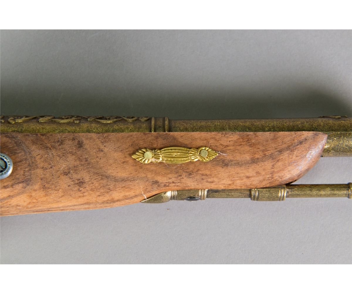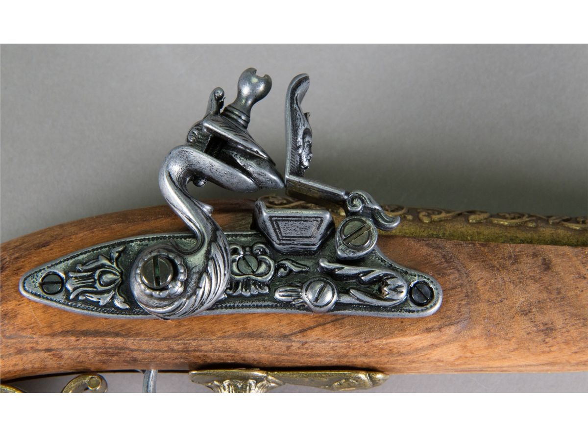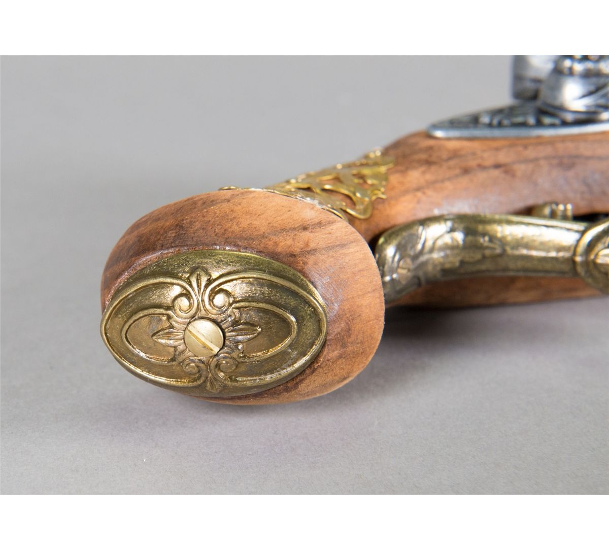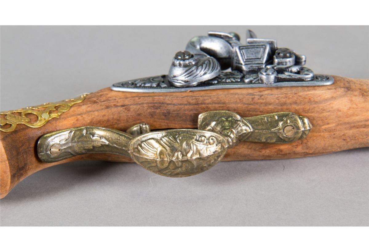 European old flintlock pistol; featuring engraving of patterns on handle and hammer; W: 10 cm, L: 38 cm, 529 grams