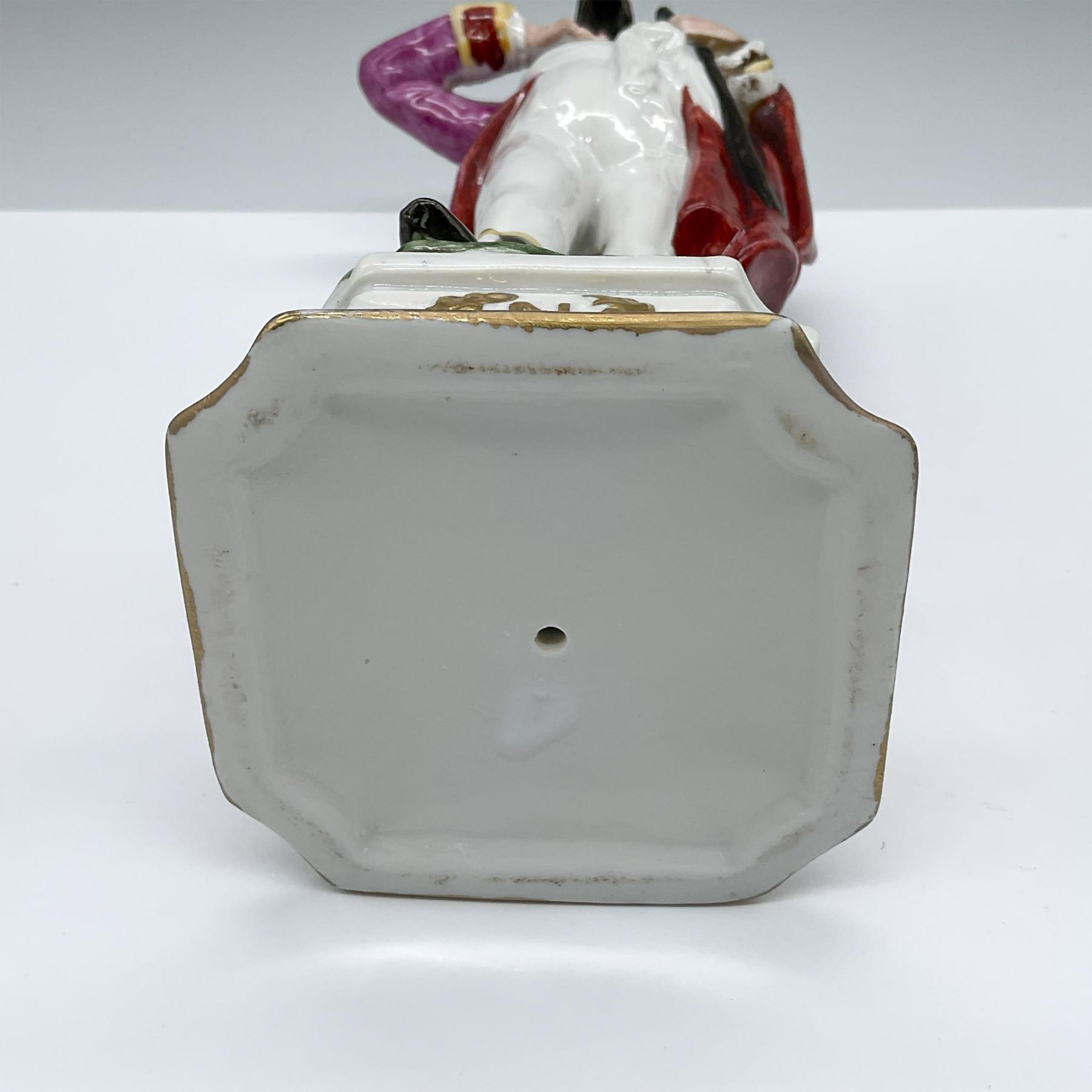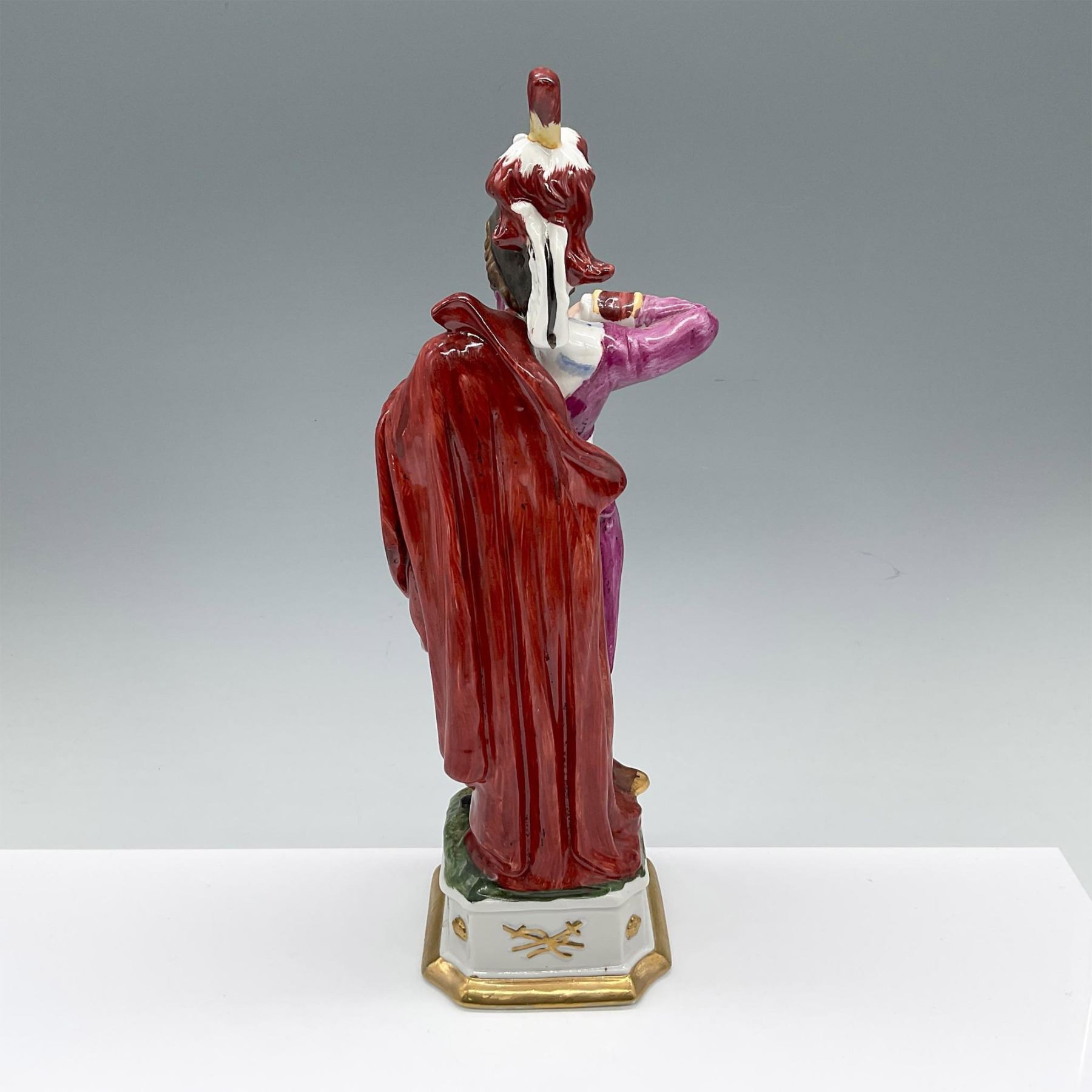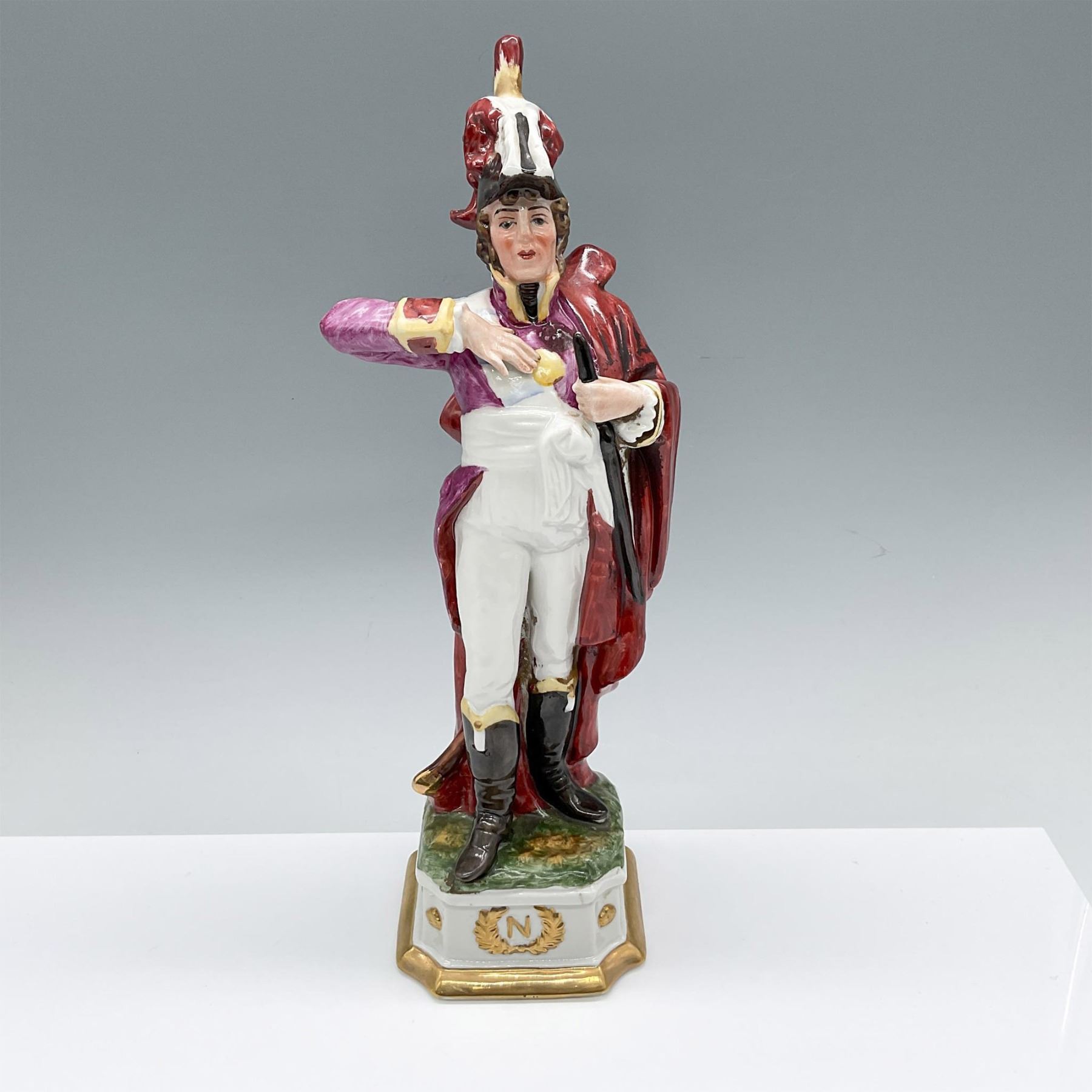 Hand modeled and hand decorated porcelain figure of a Napoleonic soldier in a long red cloak and bicorn hat with red feathers. Red, purple, yellow, white, brown, and gilded colorations.