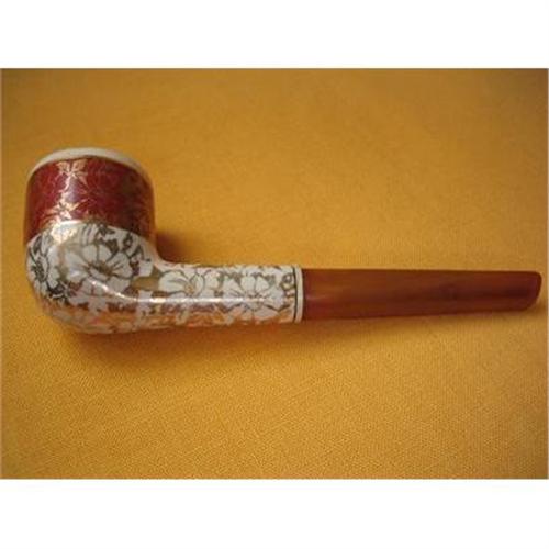 This vintage floral porcelain pipe with what looks to be an amber stem is European made. Off white in color with a maroon band and outlined in gold around the flowers this pipe came from an estate auction and is in need of sanitizing, it looks hand painted but I am not sure. In very good condition it measures 5 3/4 inches long with a bowl that is 1 3/4 inches high. An addition to any vintage Pipe Collection.