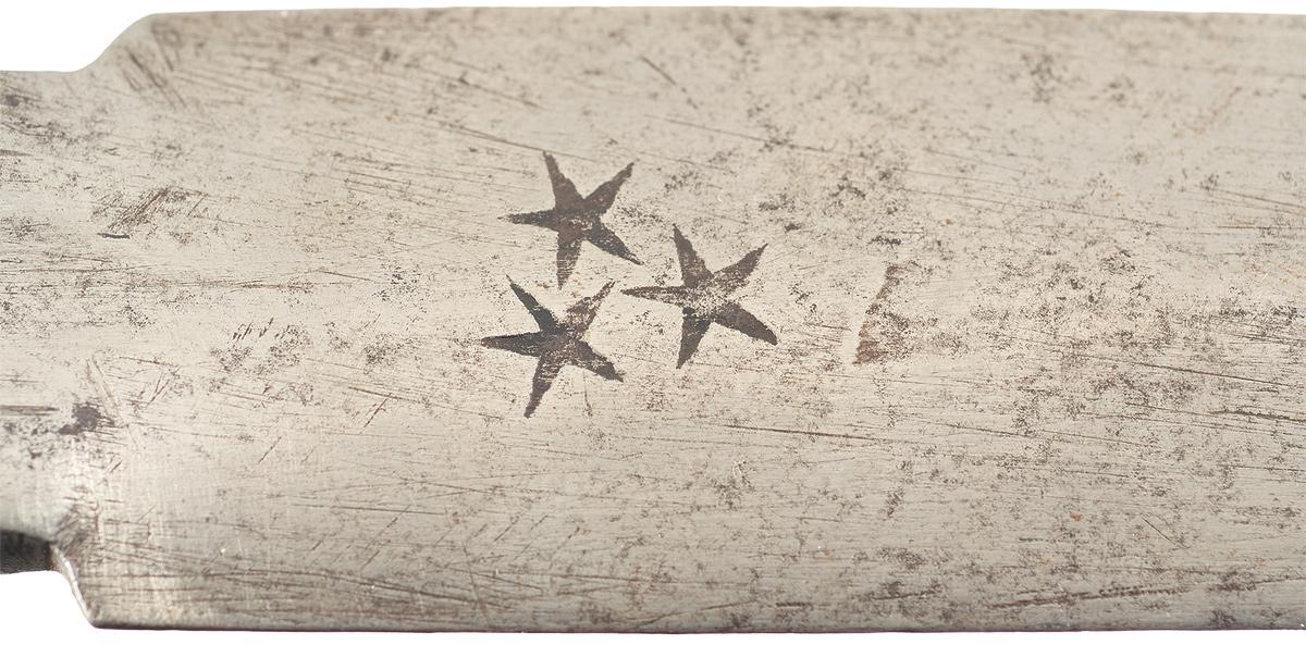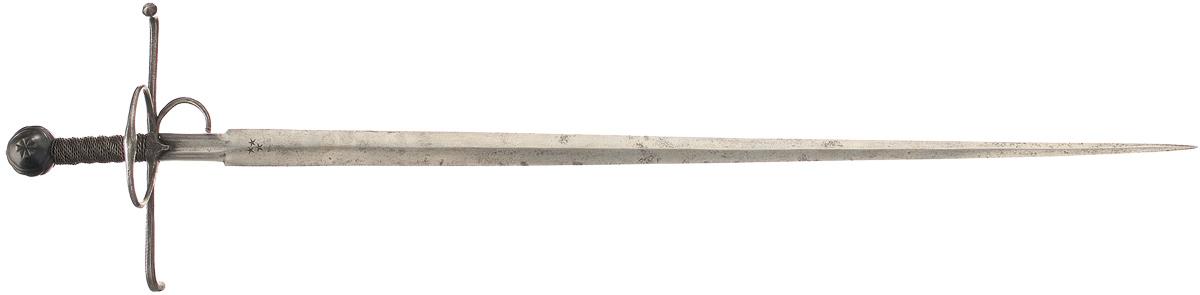 Double edged blade, measuring 38 1/2" from tip to the handguard, with a 2 1/2" grooved ricasso. One side of the blade is marked with a group of three 5-pointed stars. The hilt is fitted with a single front arm, curved to meet the ricasso, dual long quillions with turned octagonal tips, a large side ring, ball pommel with starburst designs, and a twisted wire wrapped grip.