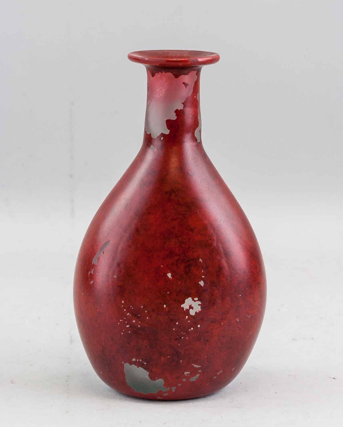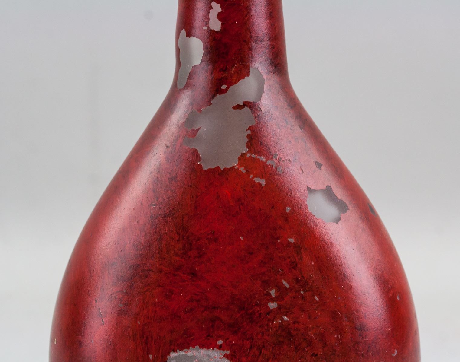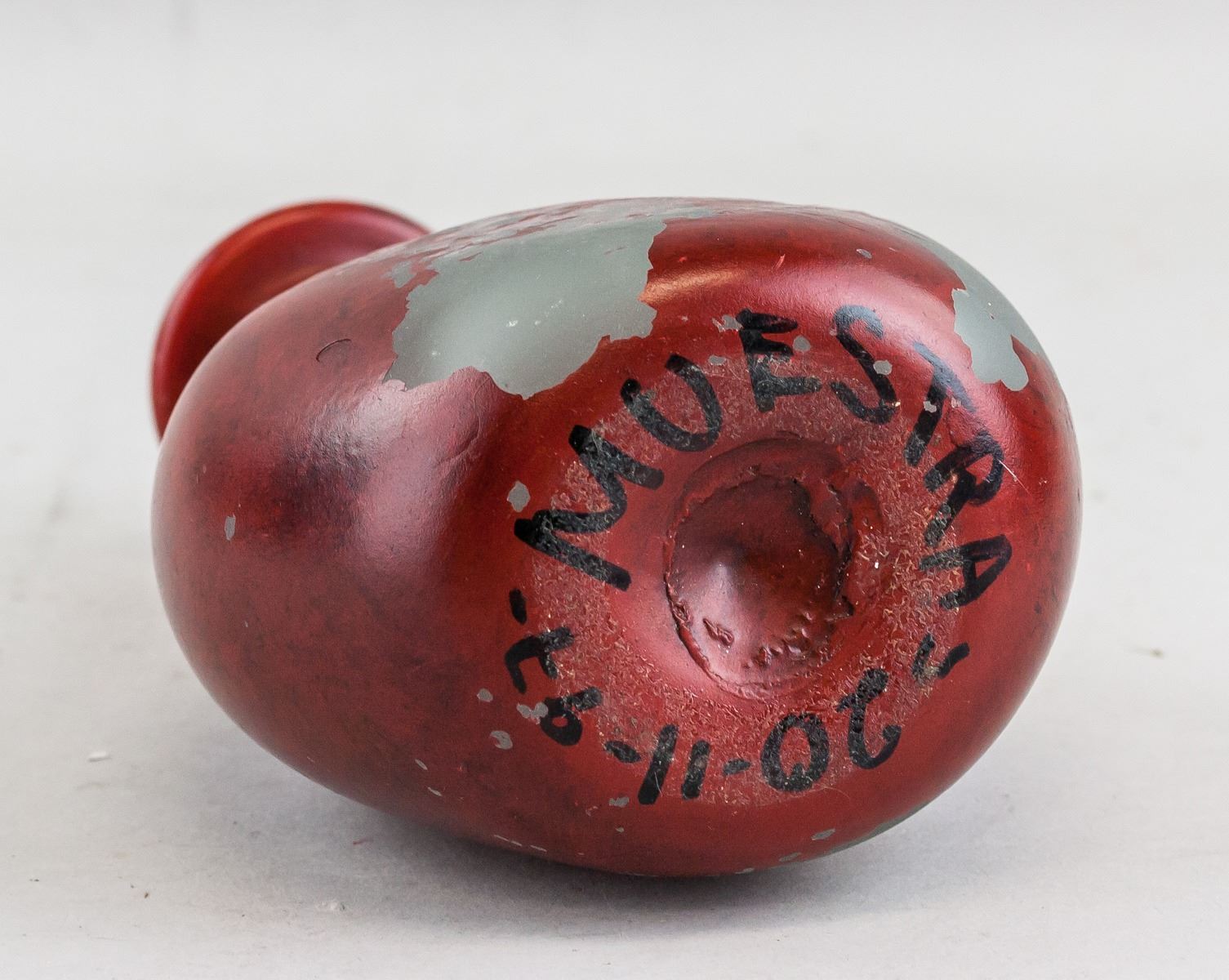 European red glass bottle. Signed MUESTRA, 20-11-97 on base. 19 x 11 cm, 466 grams