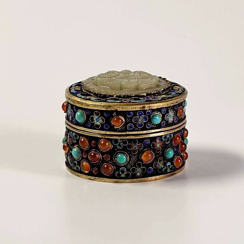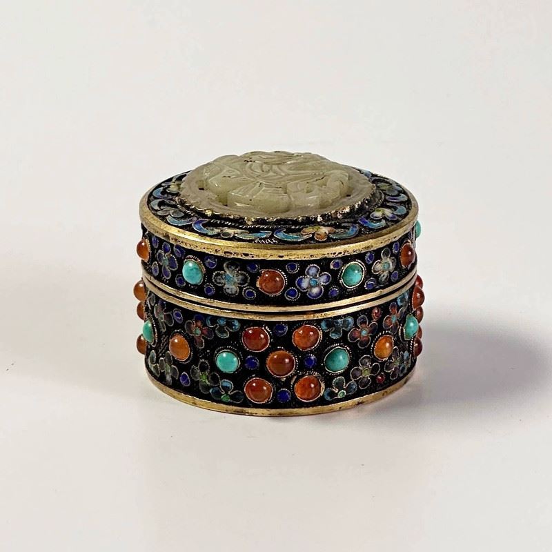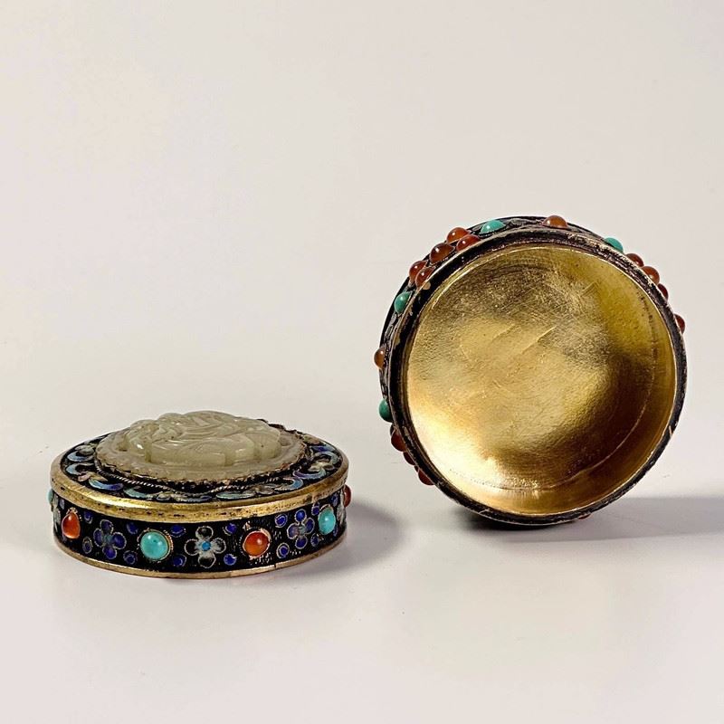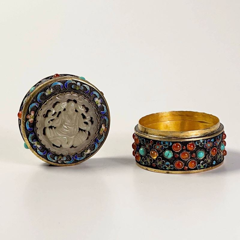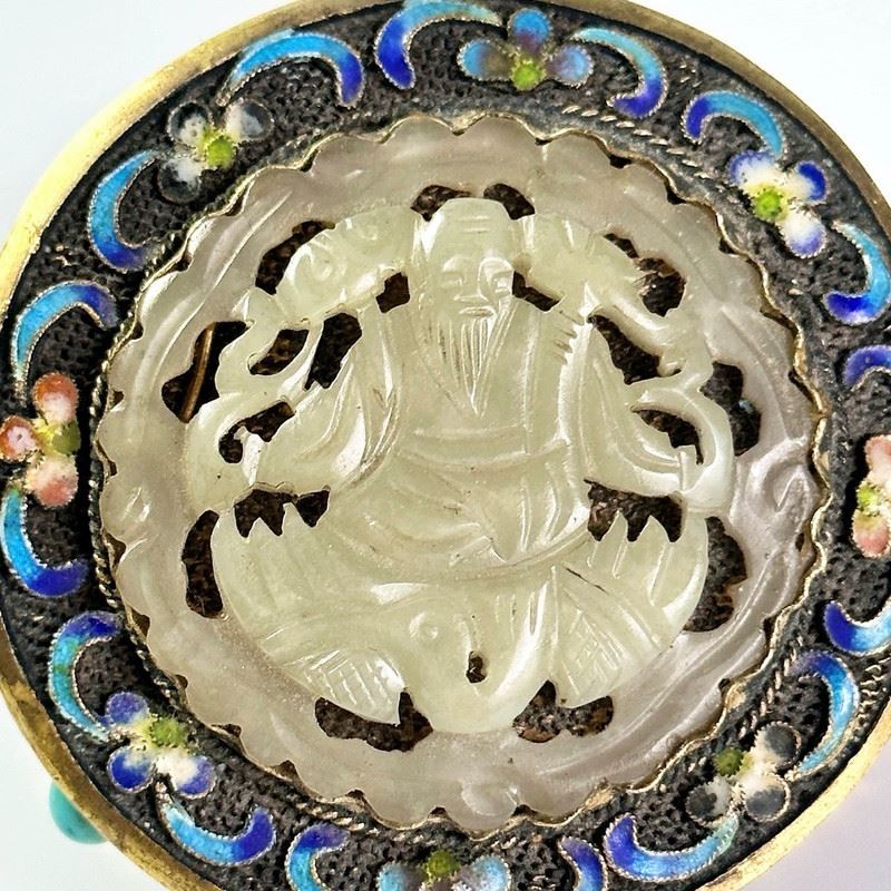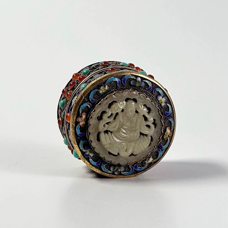 This European-returned treasure features a silver-gilt body with colorful cloisonné enamel decoration, inlaid with a finely carved Ming Dynasty Hetian white jade figure of Shouxing, the God of Longevity. The craftsmanship is exquisite, the colors brilliant, and the piece symbolizes auspiciousness and longevity, making it valuable both as a collectible and a work of art.
