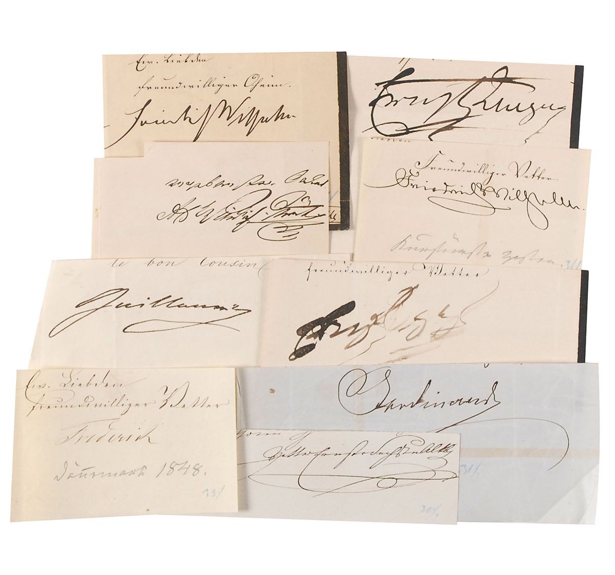 Nine ink signatures of 19th-century European rulers on individual slips, including: Prince Friedrich Wilhelm of Hesse; Ernest Augustus I of Hanover (2); Frederick VII of Denmark; Ernst II, Duke of Saxe-Altenburg; William III of the Netherlands; Ferdinand, Landgraf of Hesse-Homburg; Frederick William III of Prussia; and Alfred I, Prince of Windisch-Gratz. In overall fine condition.