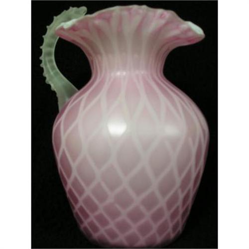 European hand blown pitcher. Very nice ruffeling around lip. The feel is like satin and the diamond pattern is perfect. It is a lovely clear white inside. The handle is a satin translucent beautifully styled so that if you wanted to do more than look at this peice, it has a great grip.