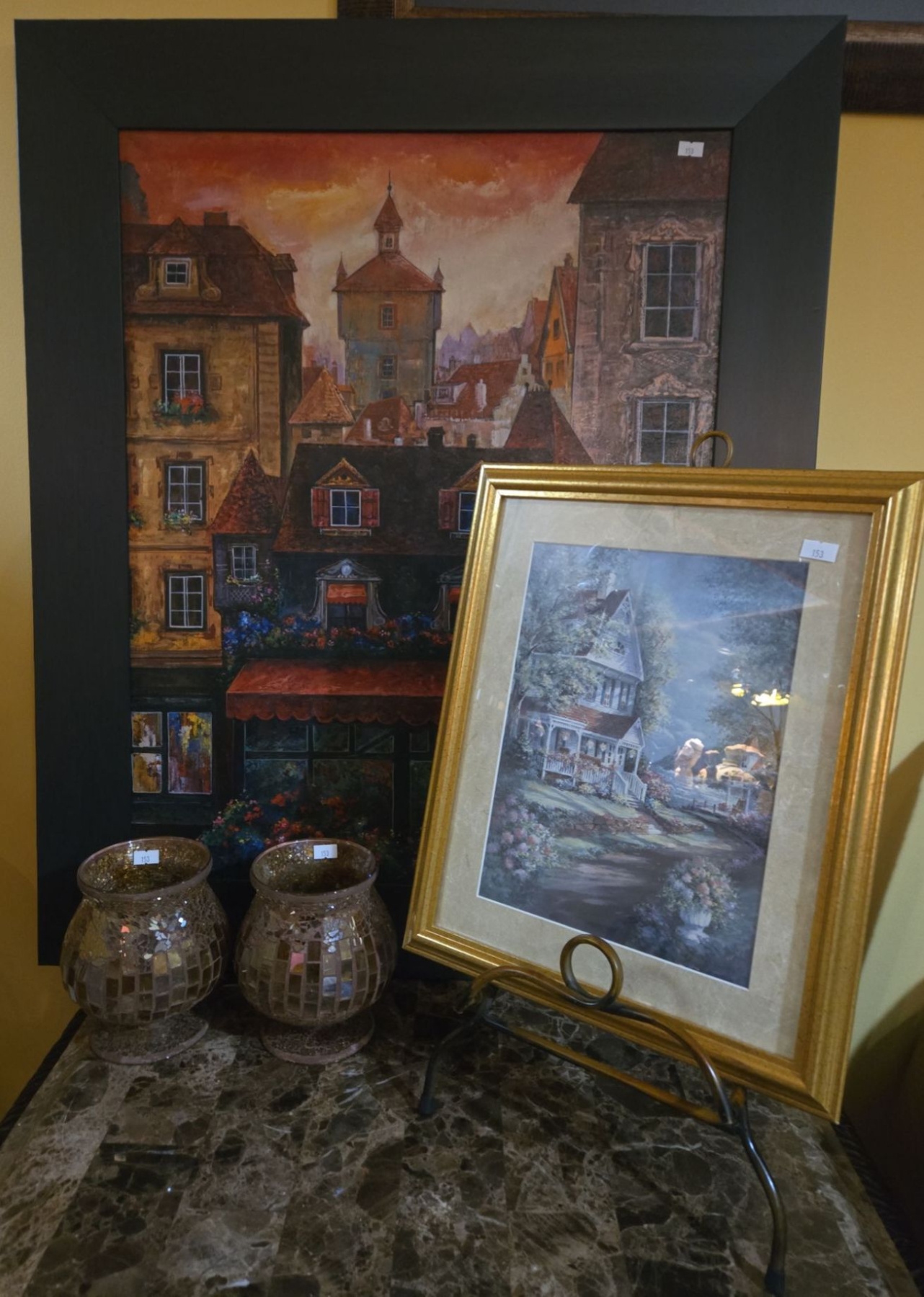 European Scenery Print (29x35), Cottage Print on Stand Plus Glass Vases