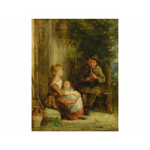 [19th century] MOTHER AND CHILD LISTEN AS FATHER PLAYS THE FLUTE oil on canvas 12 x 10 in. (30.5 x 25.4 cm)