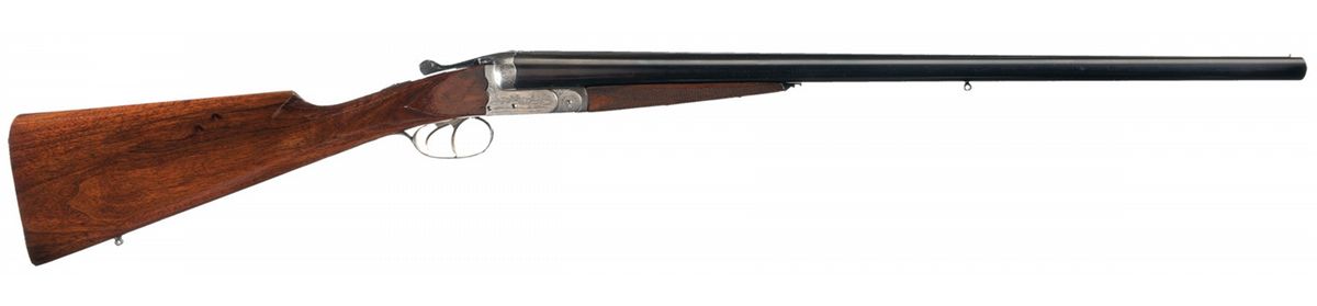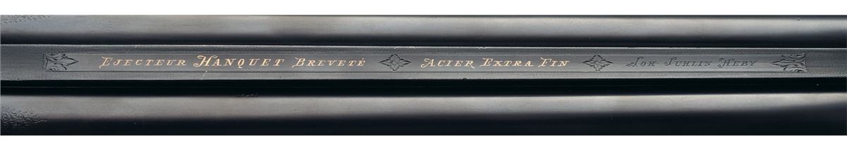 Single bead sight on rib marked "EJECTEUR HANQUET BREVETE ACIER EXTRA FIN" highlighted in gold followed by "Loh SUHLIN HEBY" with edges of engraved scrollwork at the breech. Right barrel stamped "IMPORT". 2 1/2 inch chambers, choked modified/improved cylinder, ejectors. Proofed barrels with the Liege ELG proof, double triggers and automatic tang safety. Scroll and game scene engraved receiver with smooth straight grip stock featuring a checkered forearm and checkered bare butt. Length of pull is 15 inches.