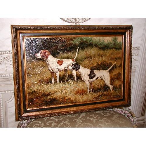 Rich tones in this signed oil painting on canvas of two pointers in the field. Various tones of green, brown and cream are vibrant against the black,brown and cream of the dogs. Very detailed. Framed in an antique gold with black liner double frame with acanthus carved leaf design on the outer lip. Signature on lower right bottom of European artist who is extremely talented and painted sometime around 1950-60,however,very aged look. Measures 36L X 27H.