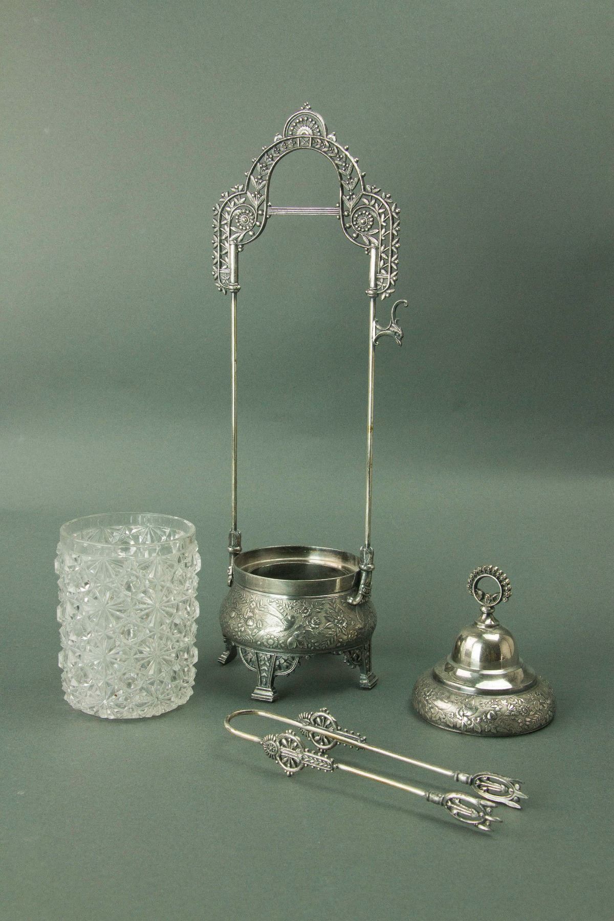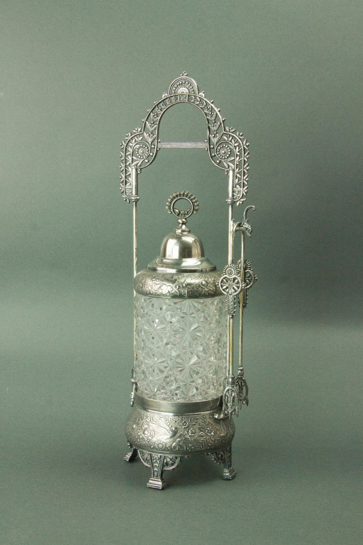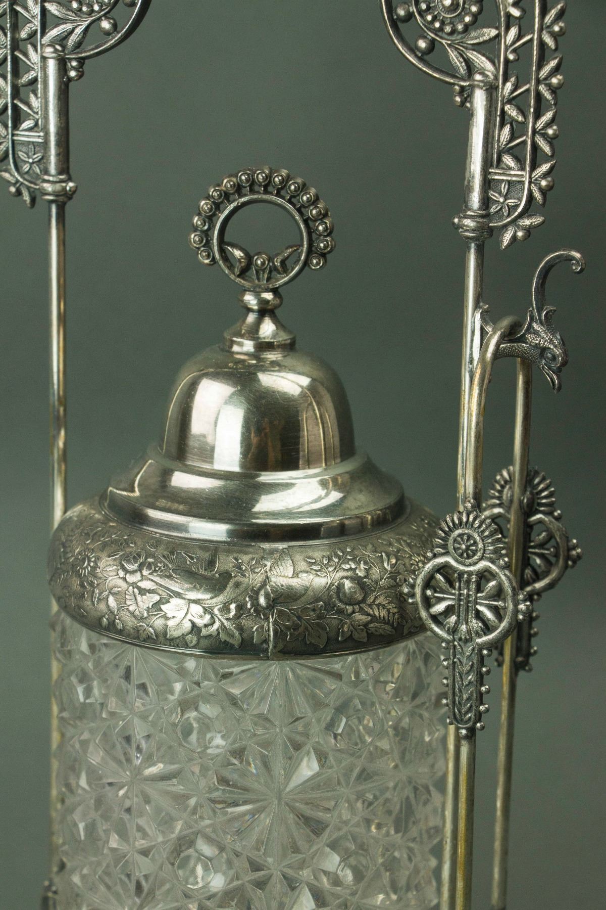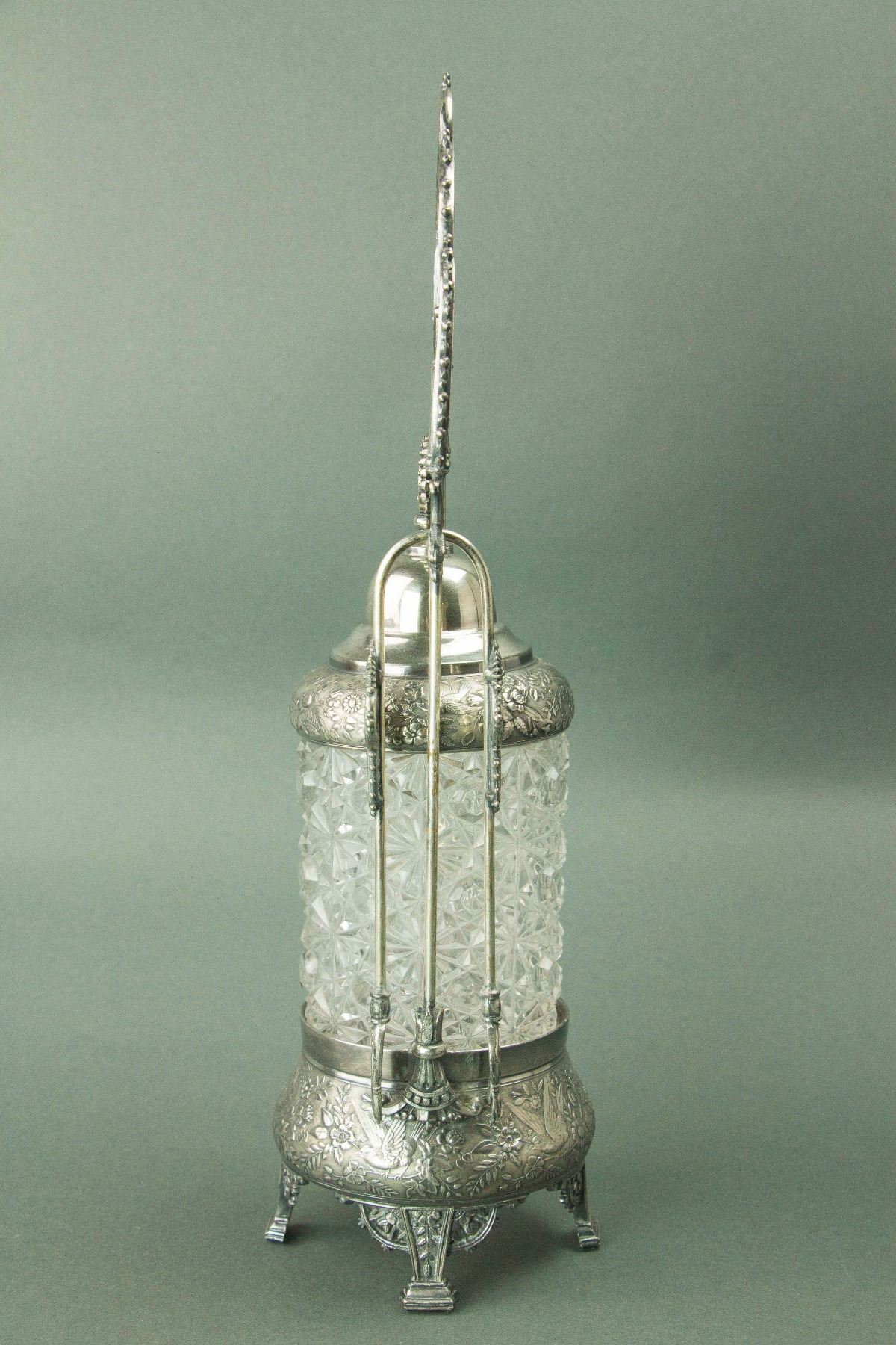 European silver plated crystal pickle pot; of a round cylinder shape; with snowflake pattern on crystal pot; silver plated three feet stand with lid and long handle; leafy and floral open work decoration on handle; with a tongs has open work decoration; H: 37 cm, W: 12 cm, 966 grams