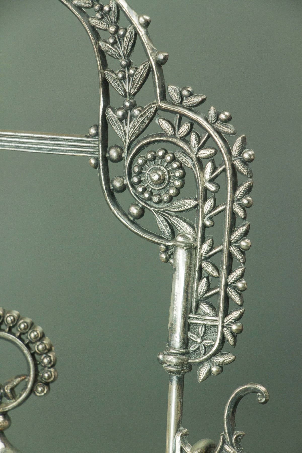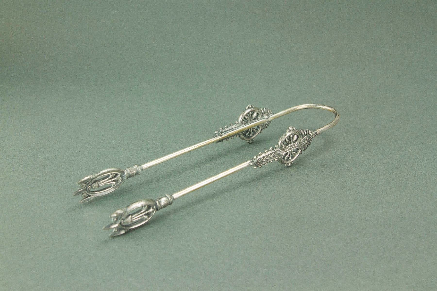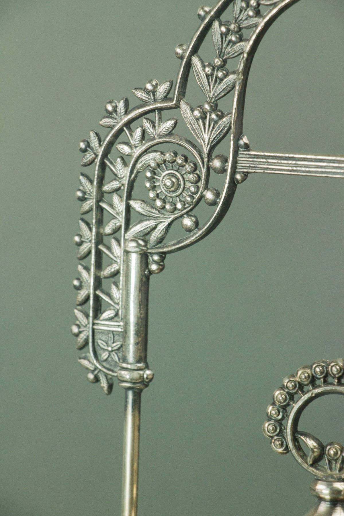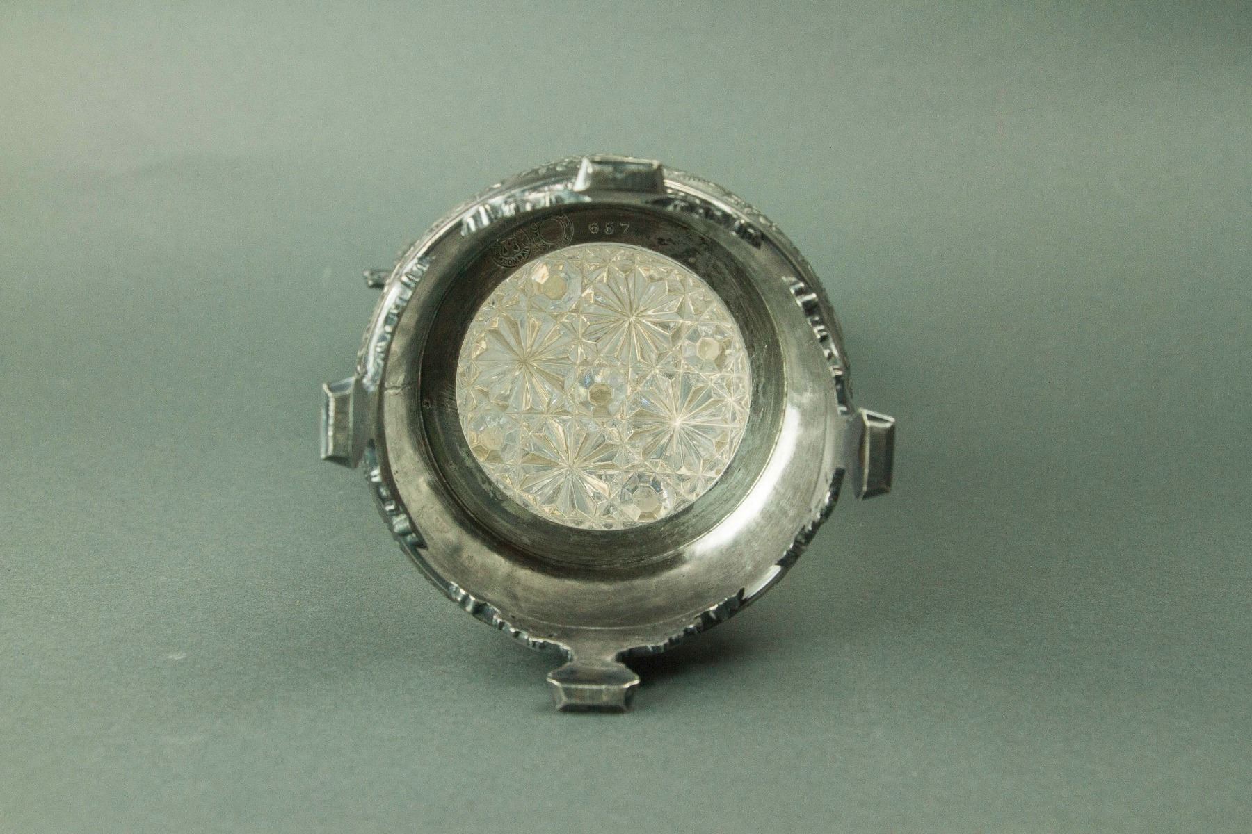 European silver plated crystal pickle pot; of a round cylinder shape; with snowflake pattern on crystal pot; silver plated three feet stand with lid and long handle; leafy and floral open work decoration on handle; with a tongs has open work decoration; H: 37 cm, W: 12 cm, 966 grams