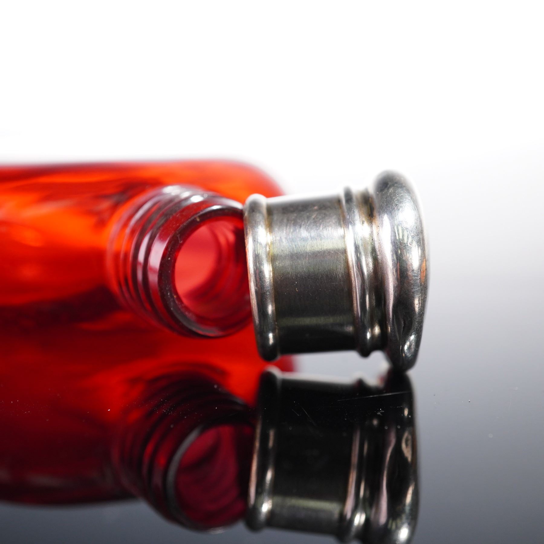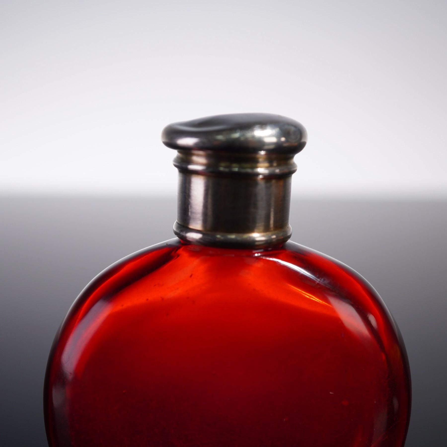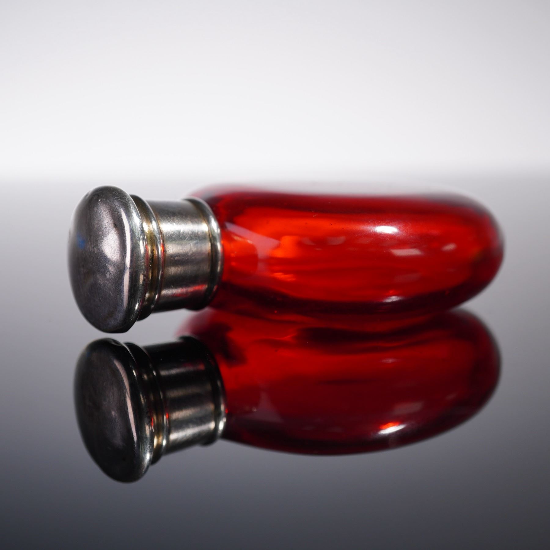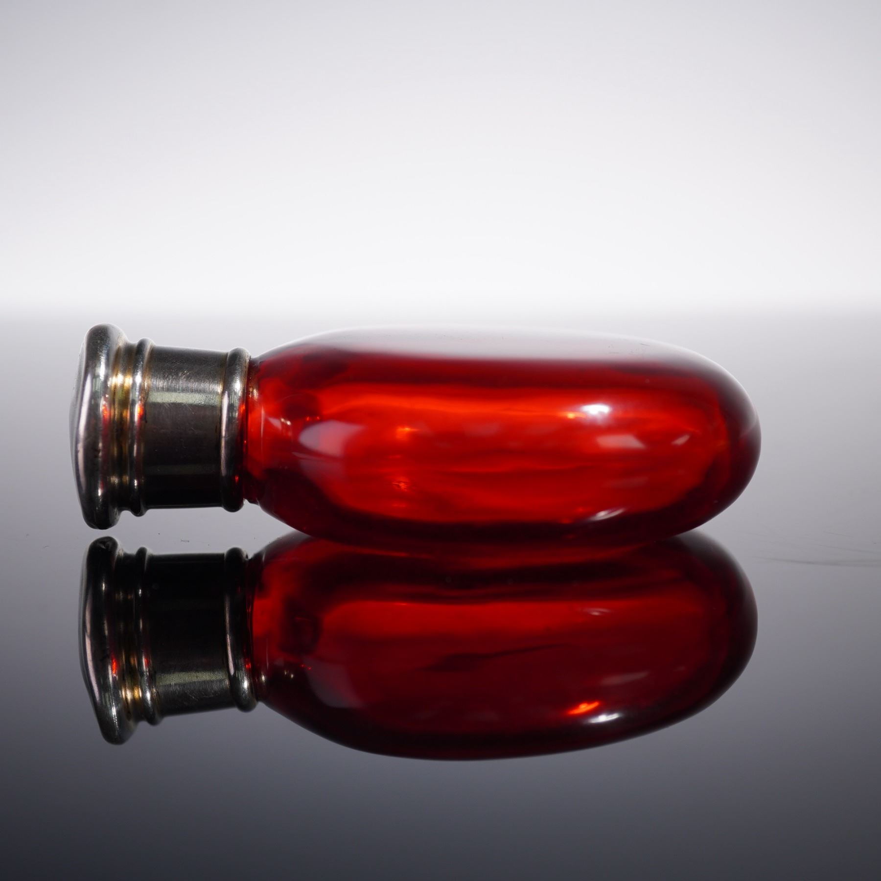 Antique European scent bottle from the late 19th century, fitted with a silverplate and metal screw cap. The rounded body is formed from vibrant ruby red glass with a smooth, slightly flattened profile, offering a rich hue that contrasts subtly with the polished metalwork, showcasing refined simplicity and attention to detail.