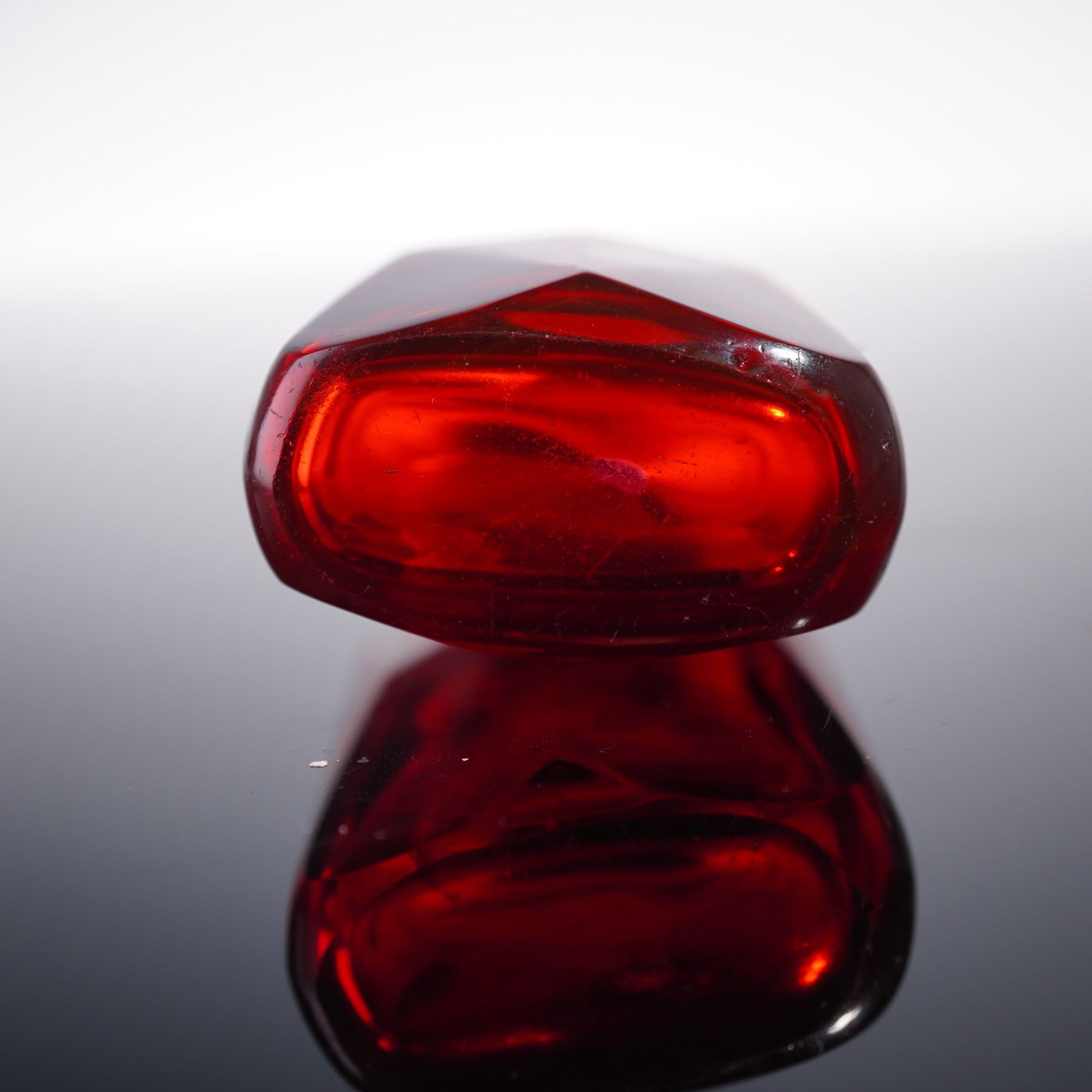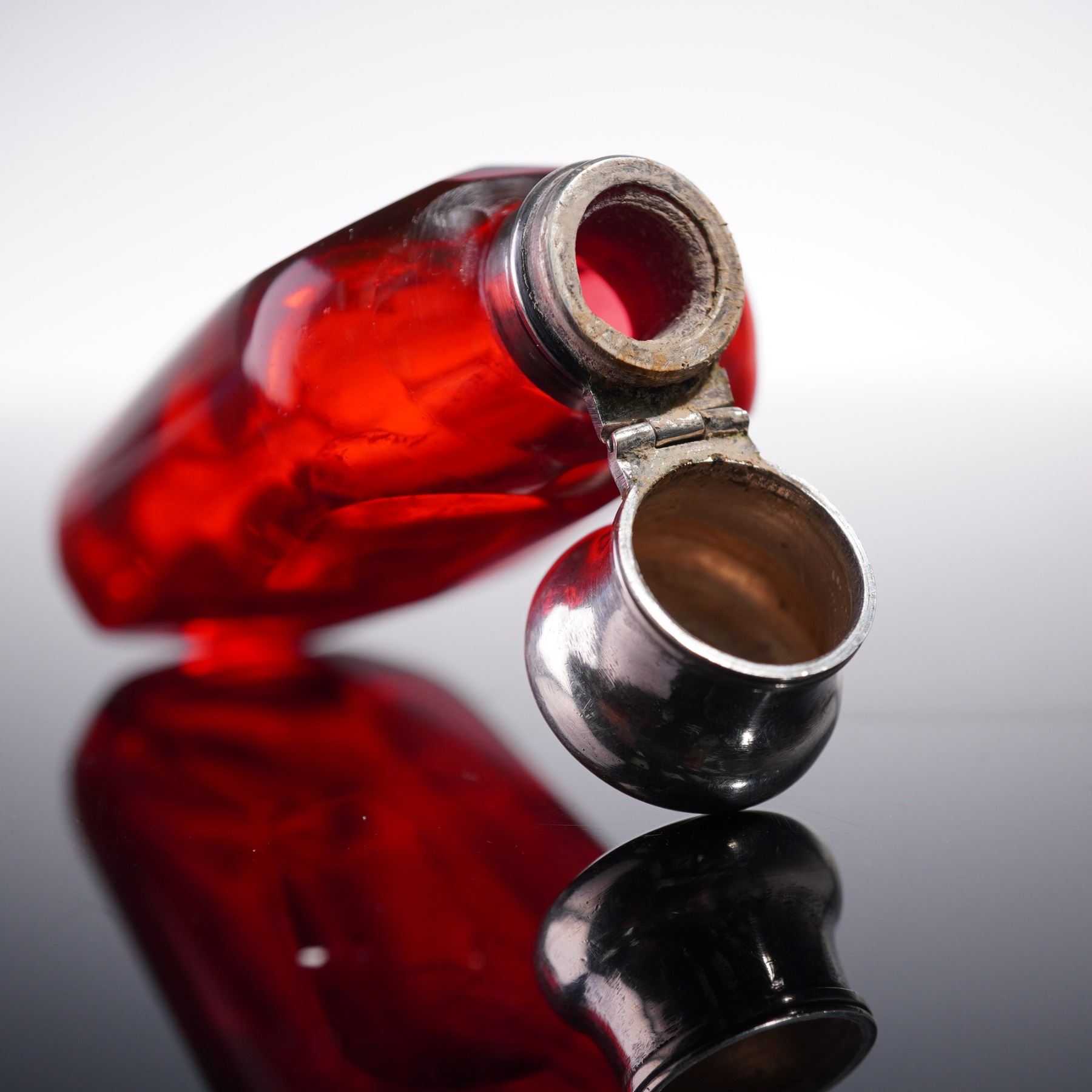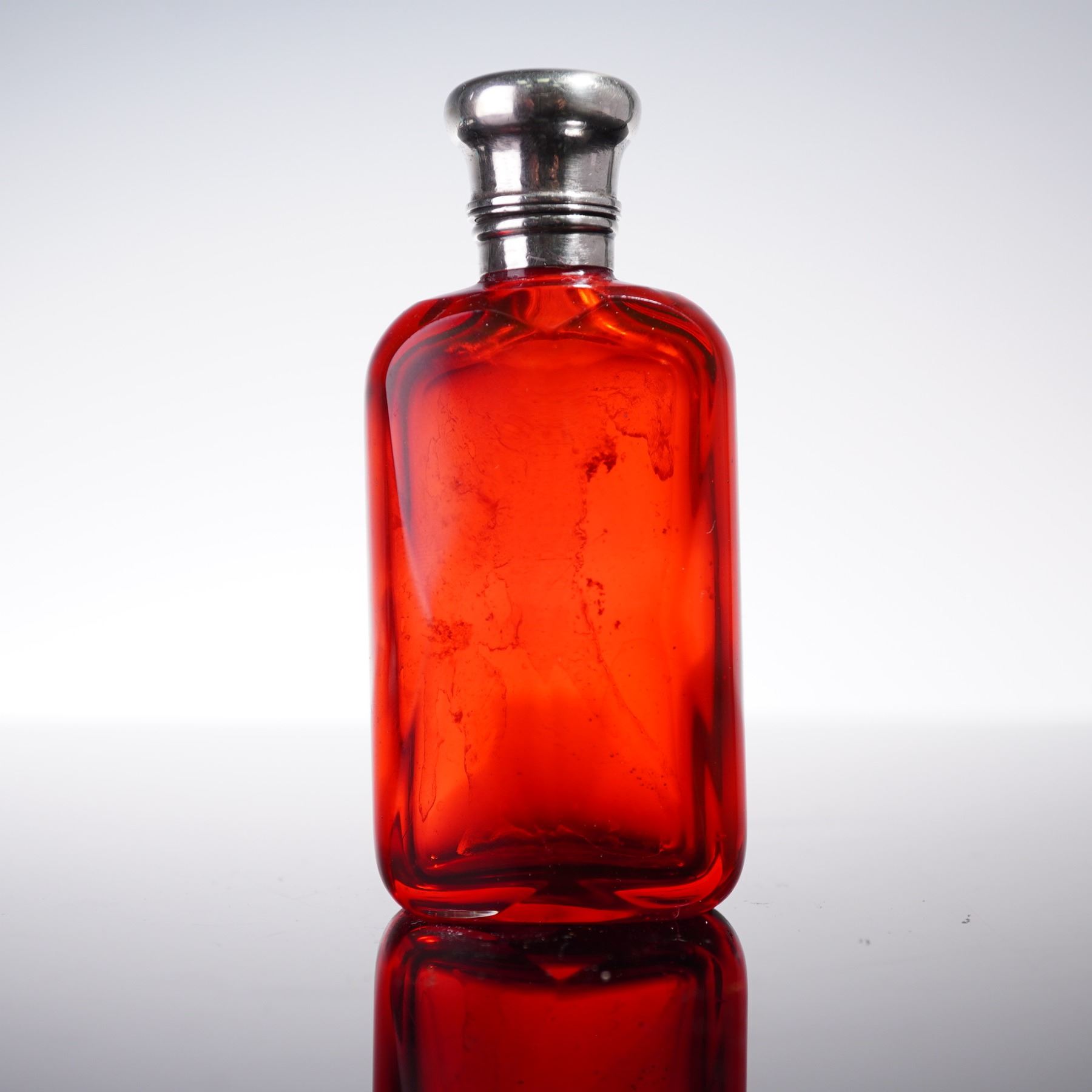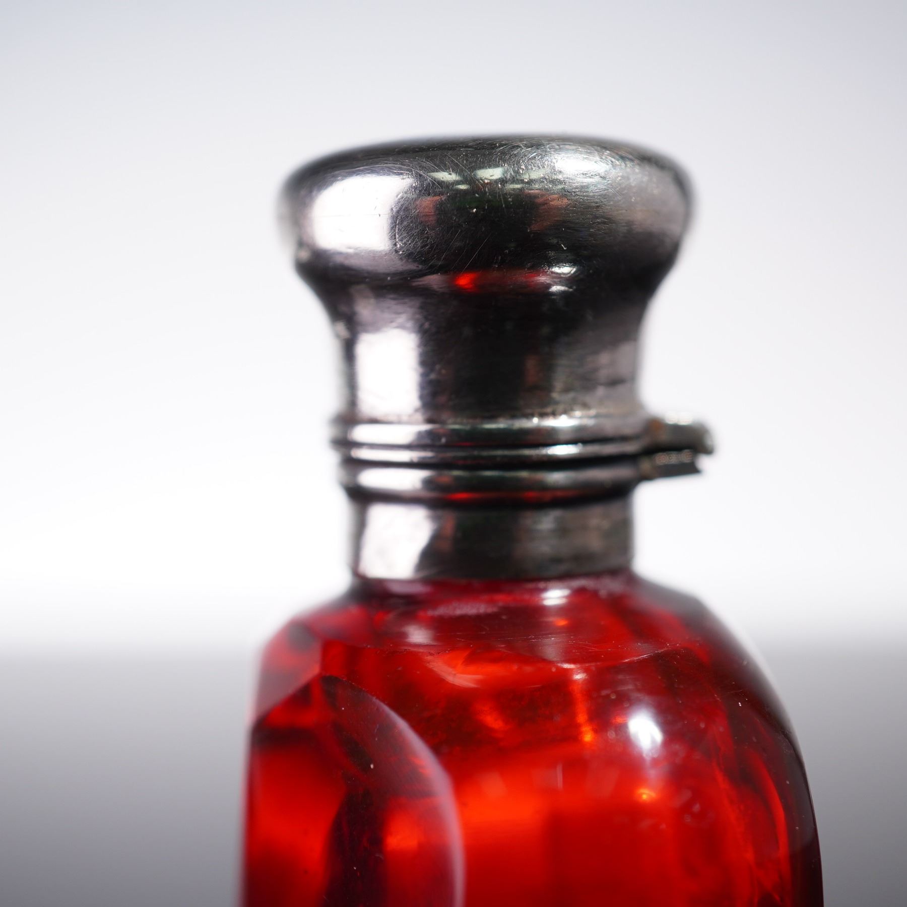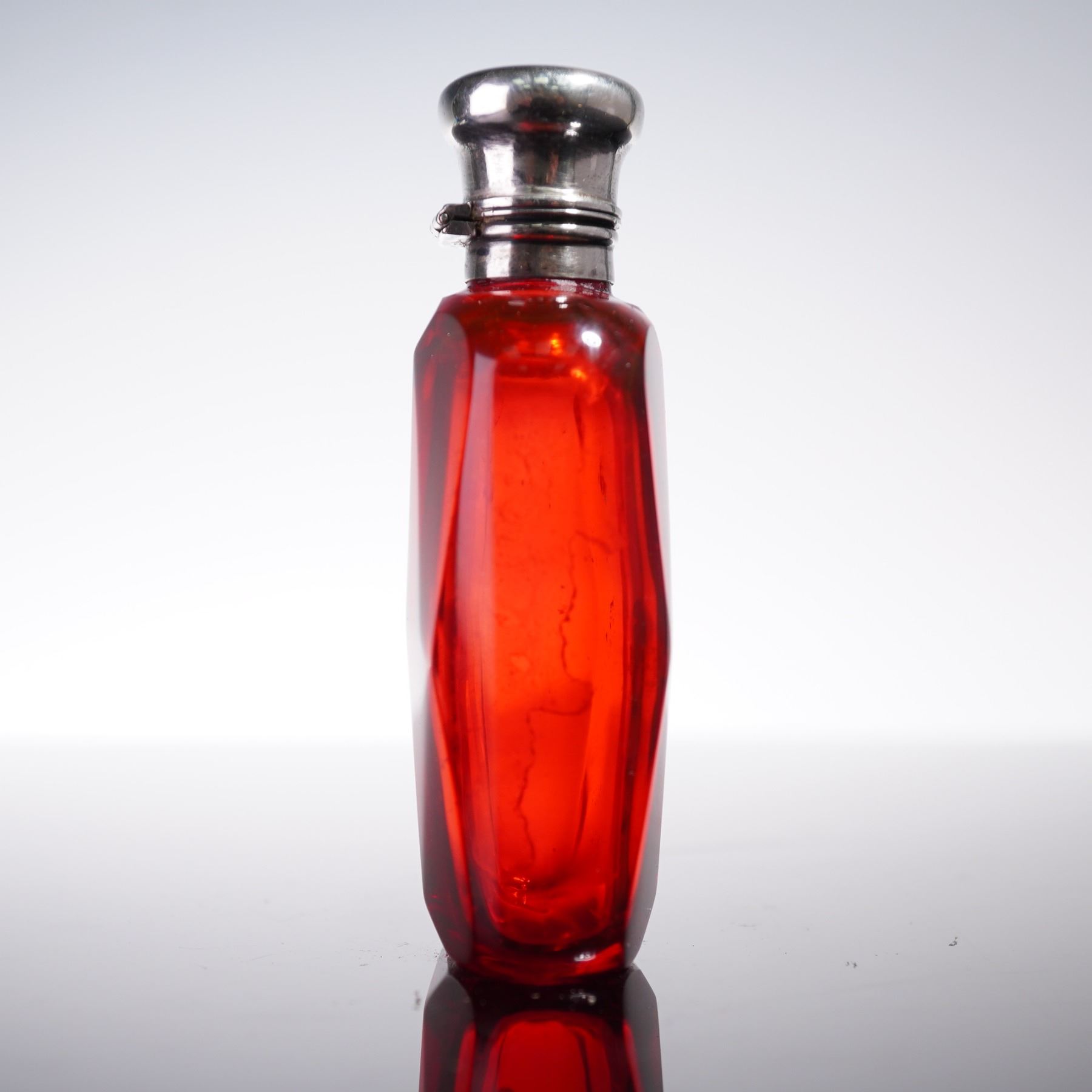 Antique European scent bottle from the late 19th century, elegantly crafted with silverplate and metal mounts. The rectangular body is formed from vibrant ruby red glass with a subtly shaped form, offering a rich hue that contrasts beautifully with the smooth metalwork, showcasing exquisite artistry and attention to detail.