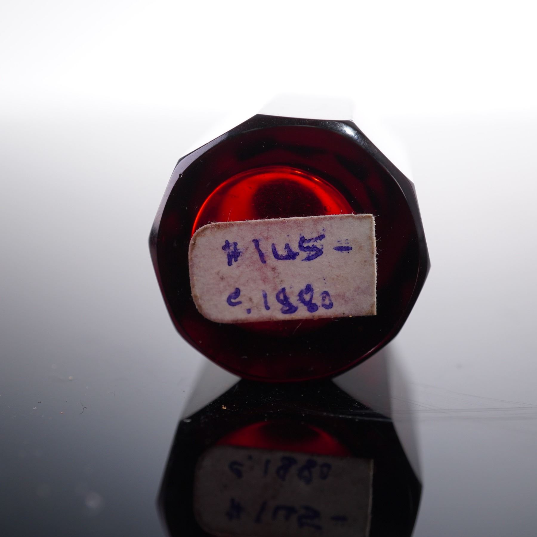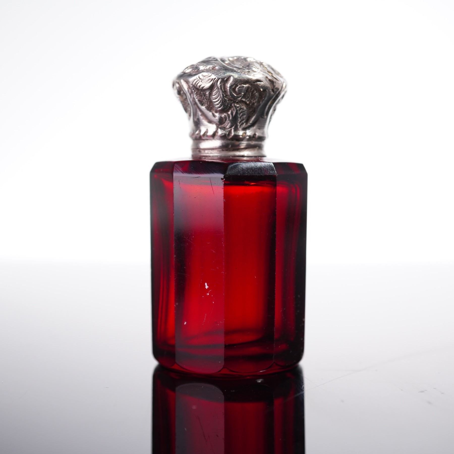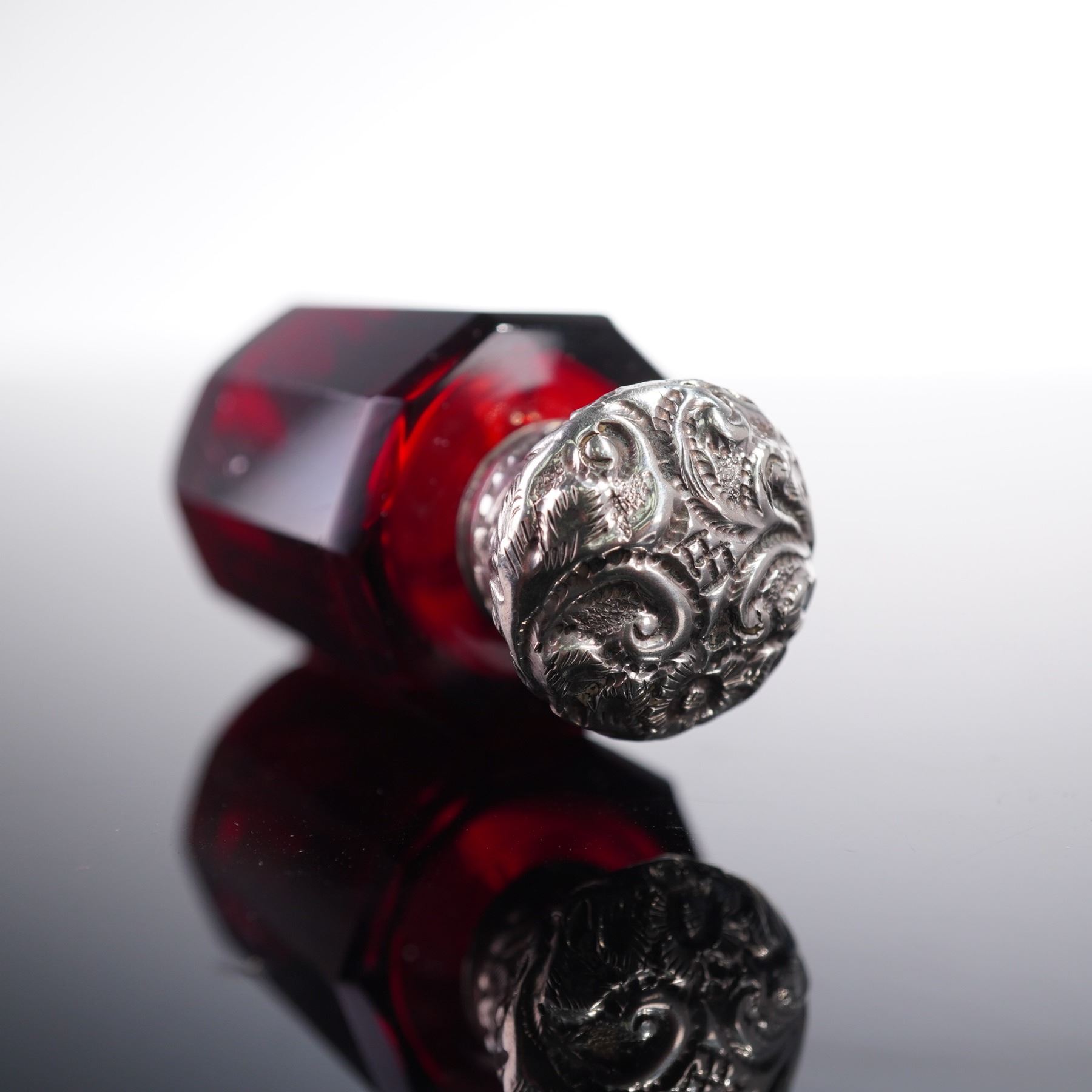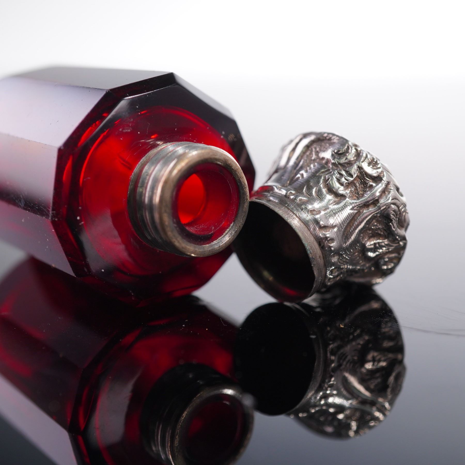 Antique European scent bottle from the late 19th century, elegantly crafted with silverplate and metal mounts. The paneled body is formed from vivid ruby red glass, offering a luminous hue that contrasts beautifully with the ornate metalwork, showcasing exquisite artistry and attention to detail.