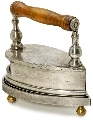 Kasteneisen mit Untersetzer, um 1830 Geschmiedetes Eisen, norddeutsch, gedrechselter Holzbügel, ohne Bolzen, Länge: 17 cm. Mit passendem Untersetzer.